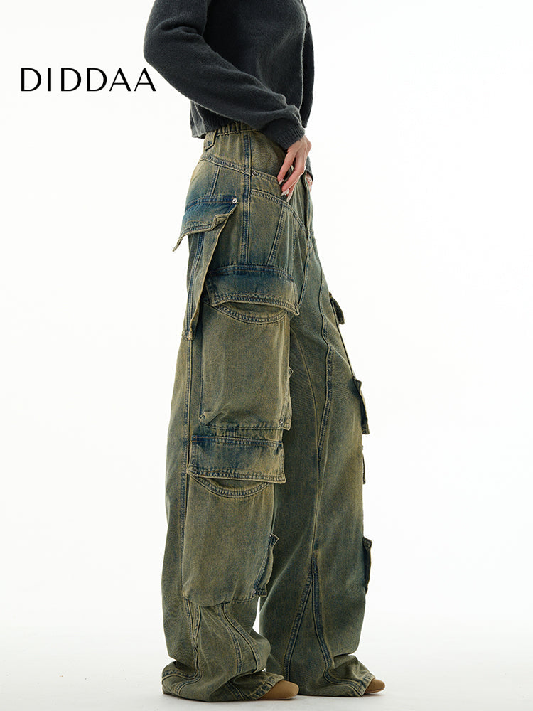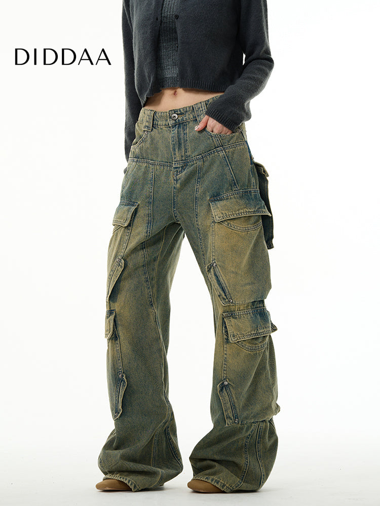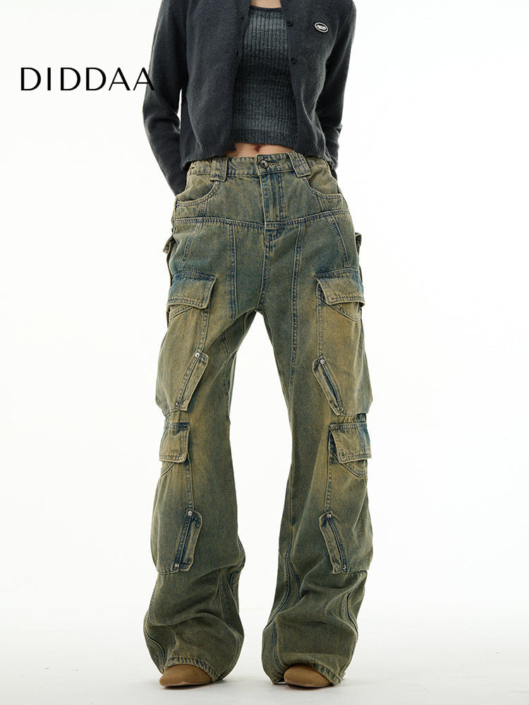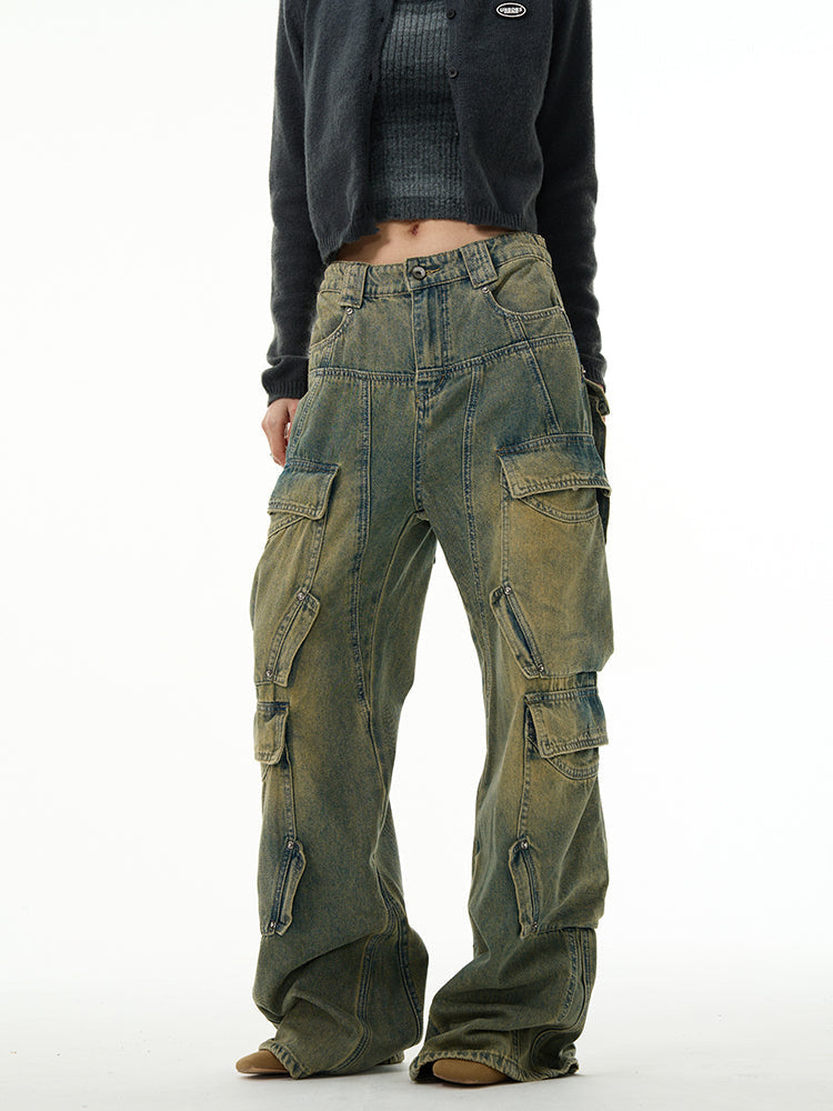 Beige Multi-Pocket Cargo Jeans for Trendy Couples