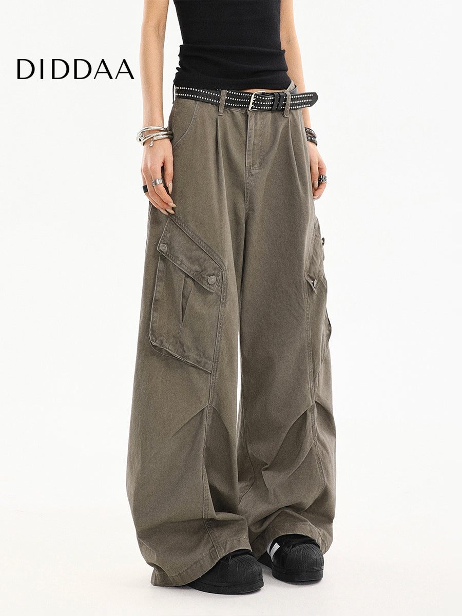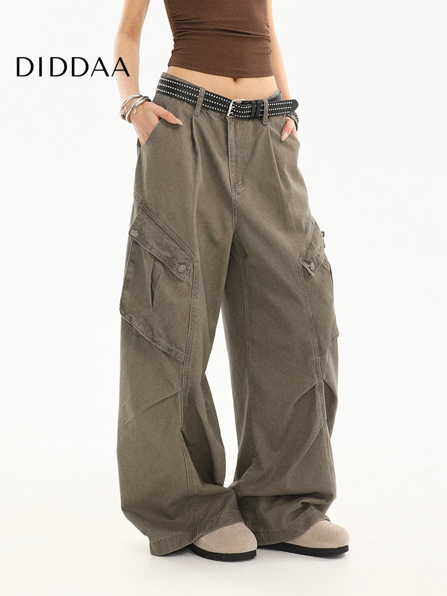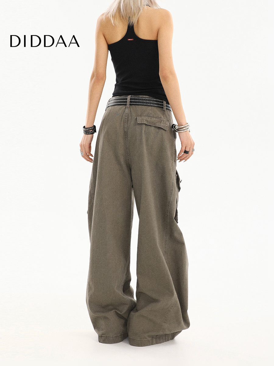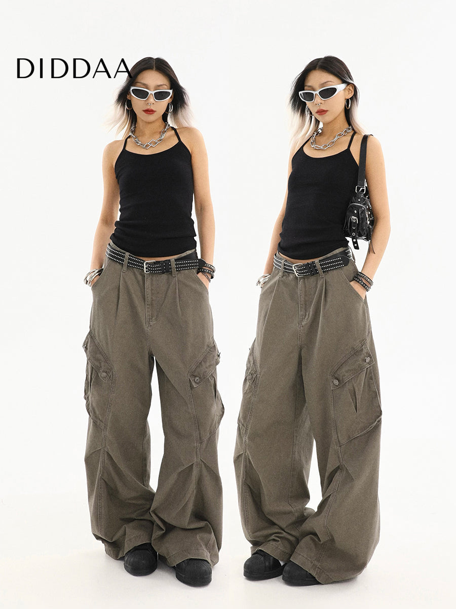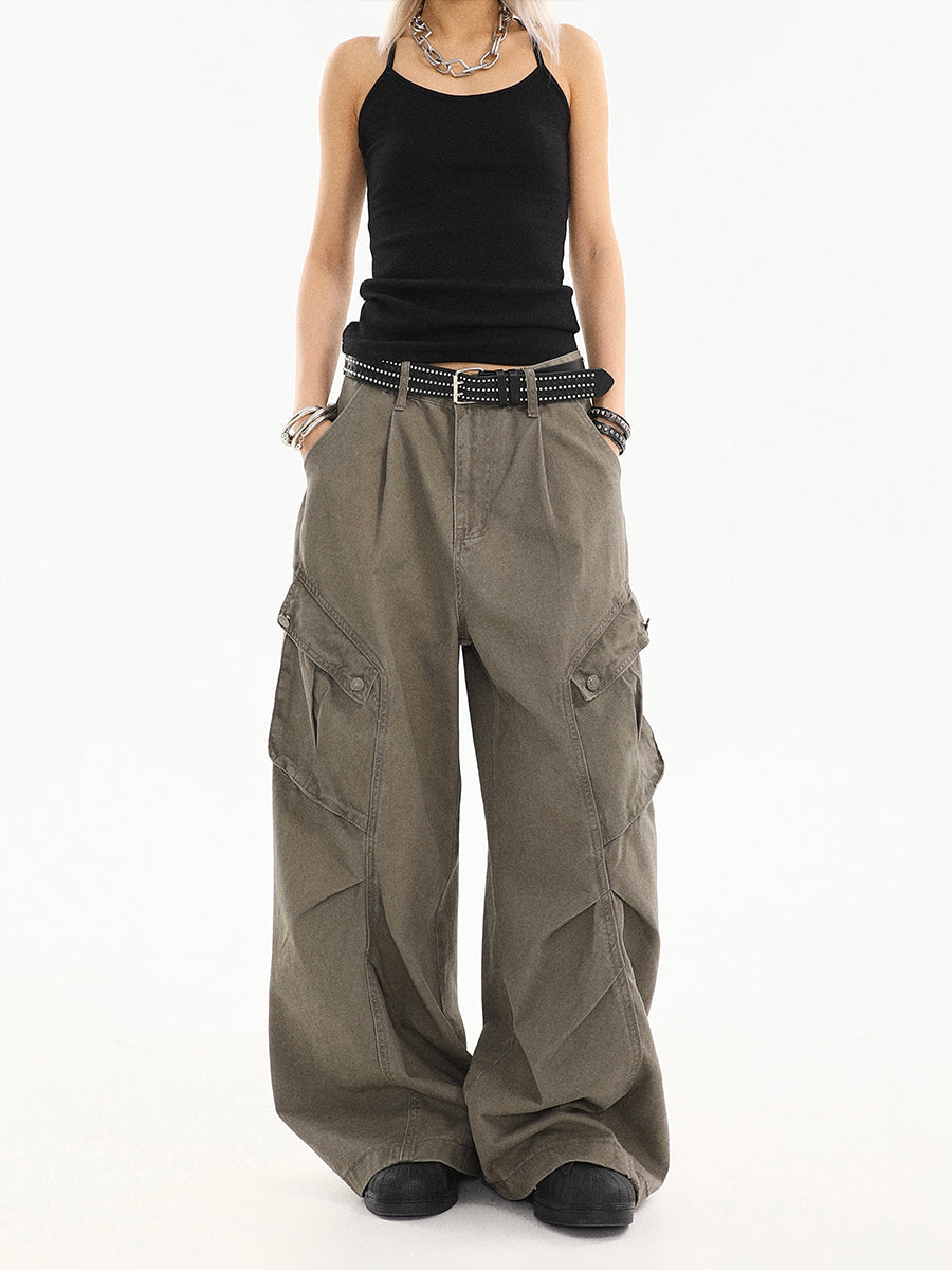Beige Pleated Loose Straight Cargo Jeans