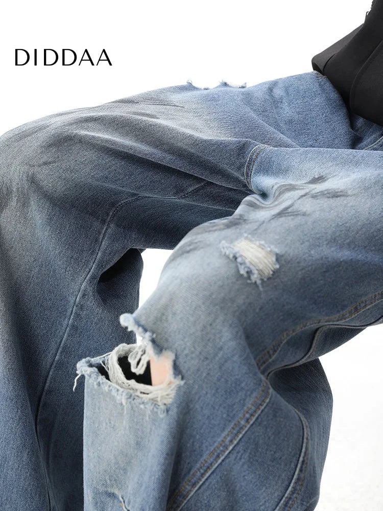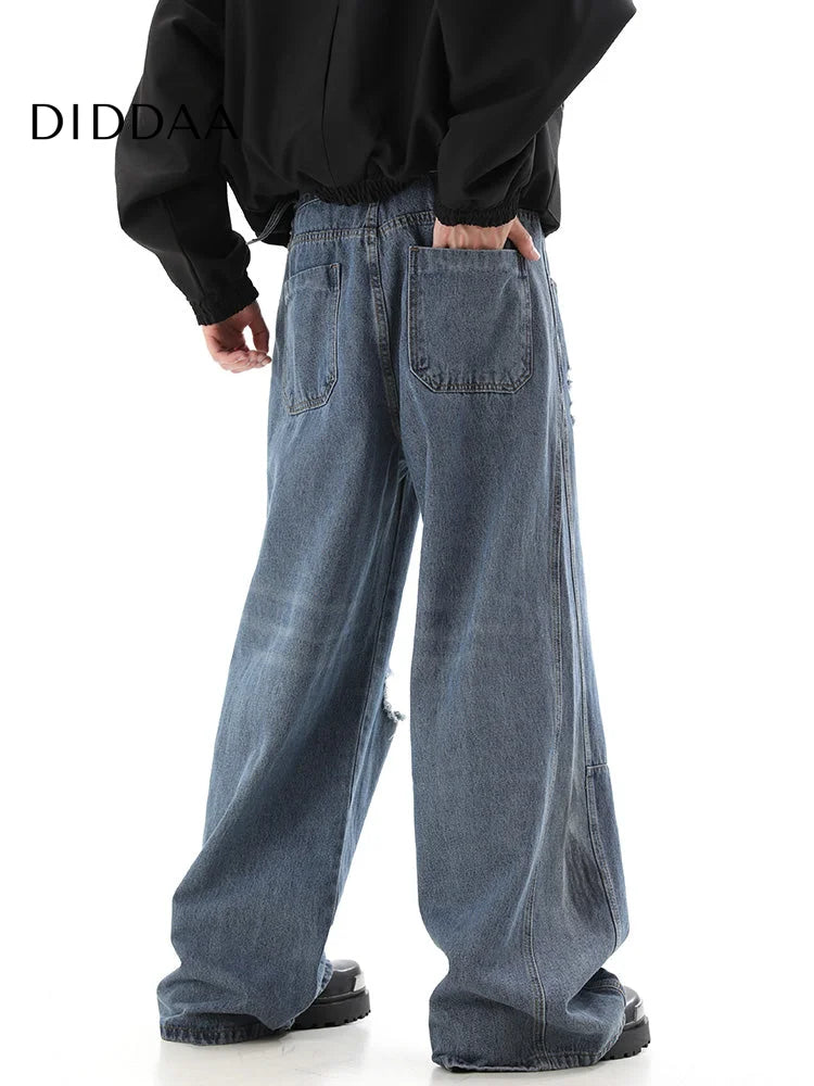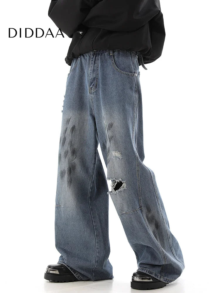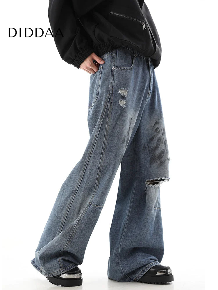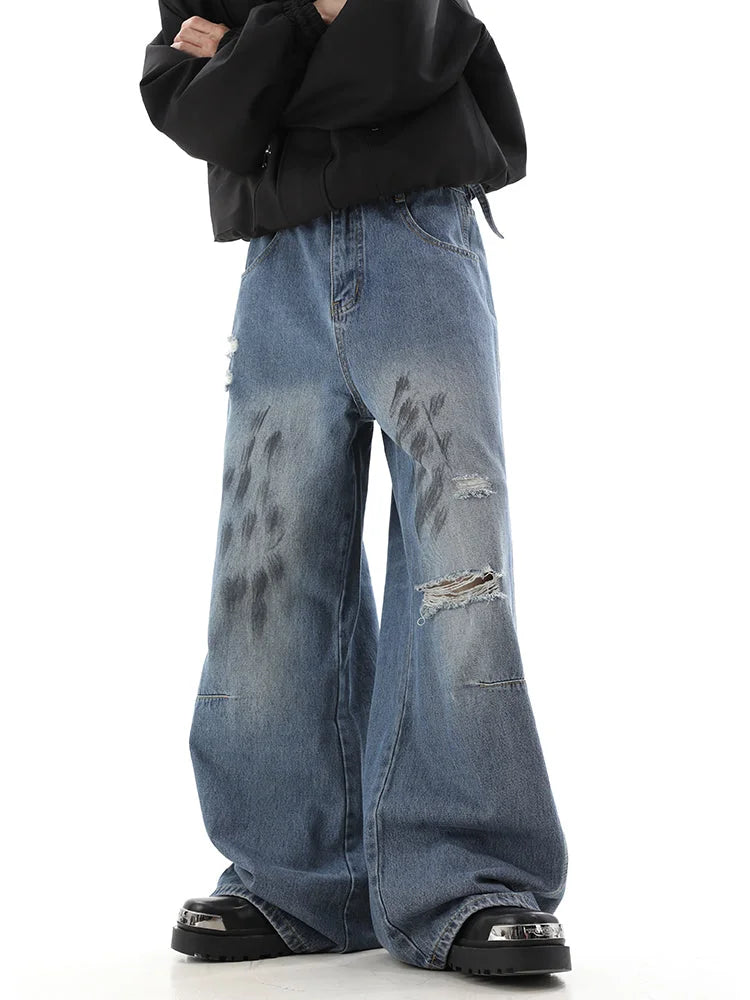 Black Distressed Mop Wide-Leg Wasteland Style Jeans