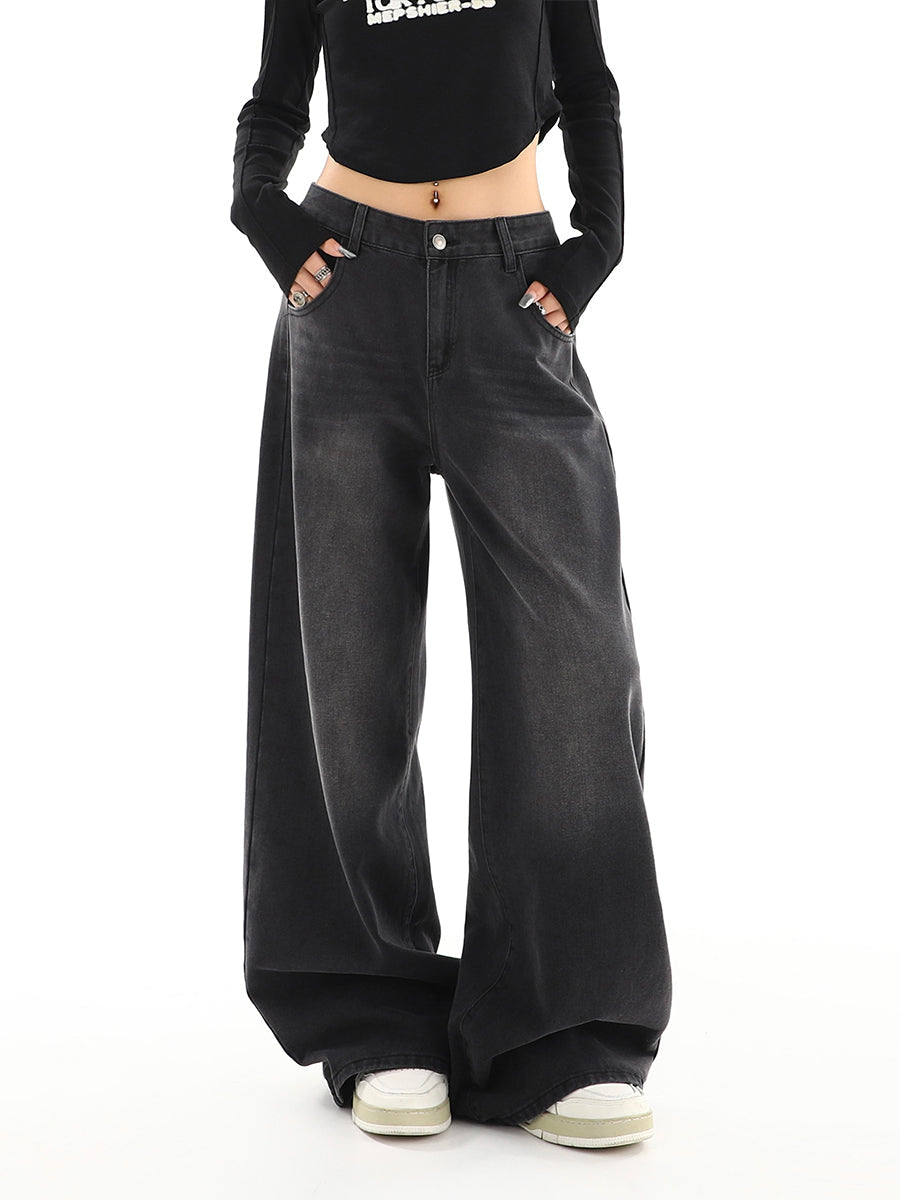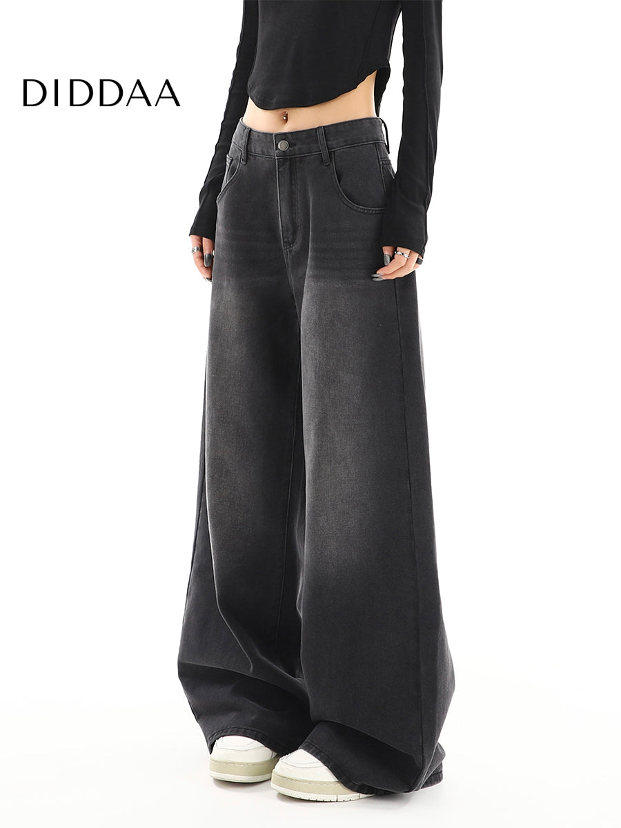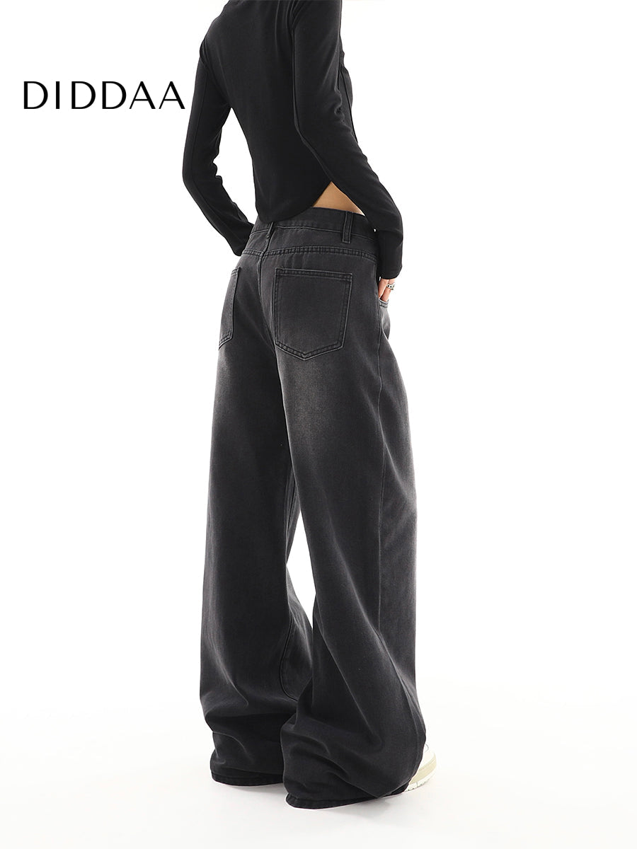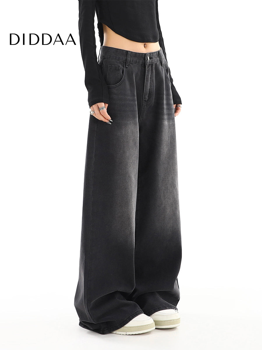 Black Gray Distressed Wide Leg Jeans Women's Retro Tide