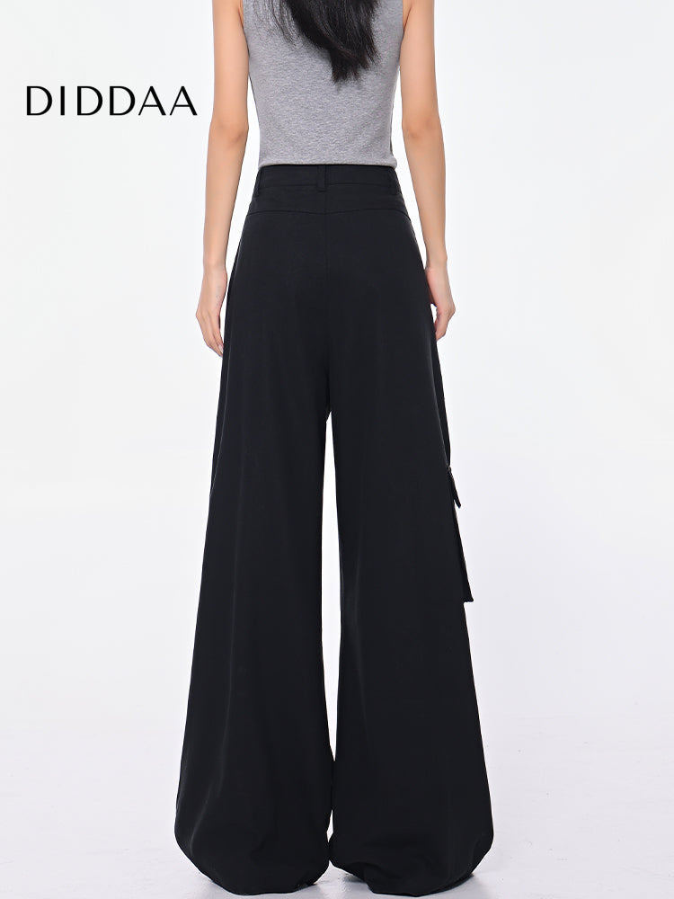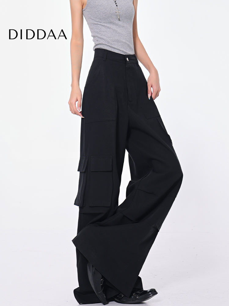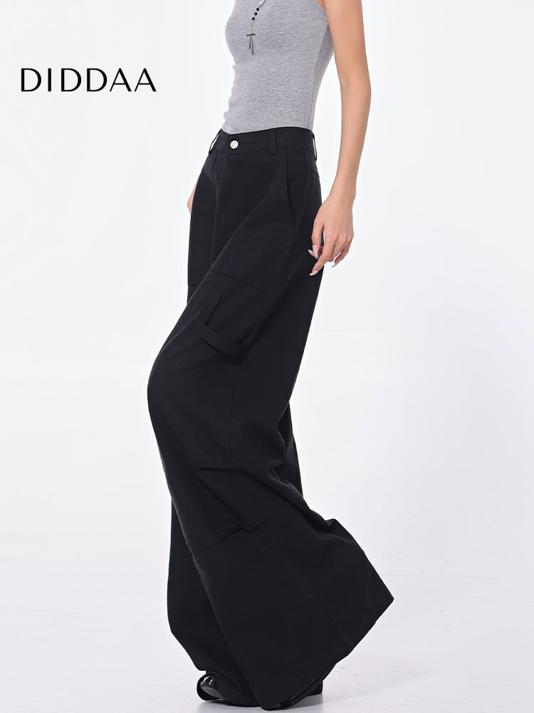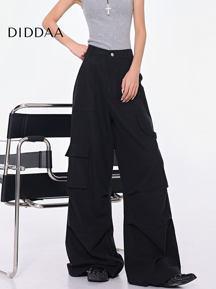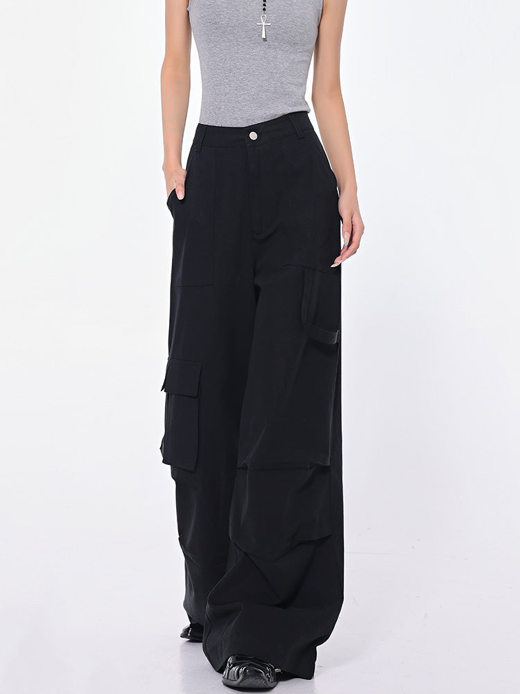 Black High Waist Pleated Cargo Jeans with Pockets