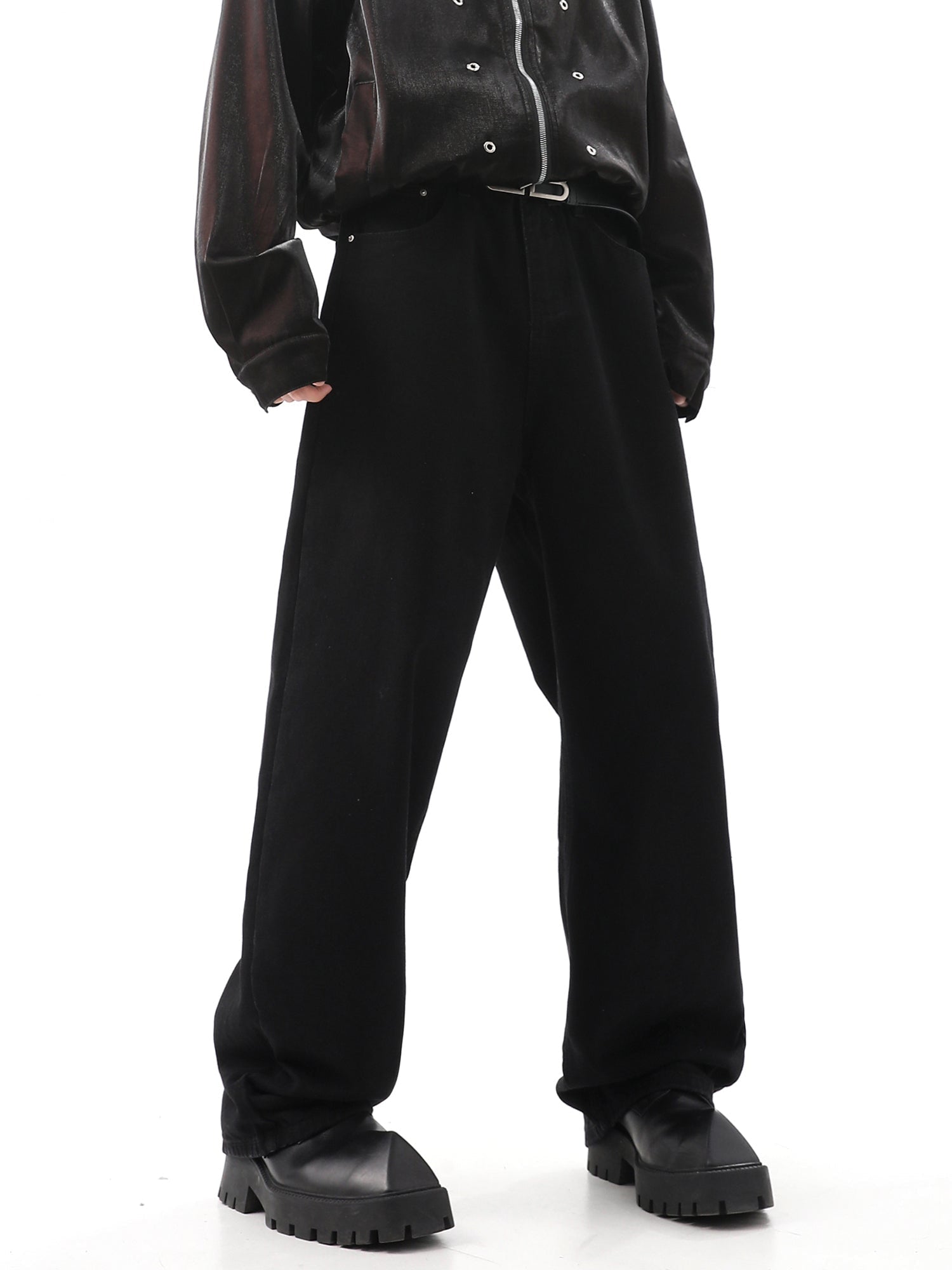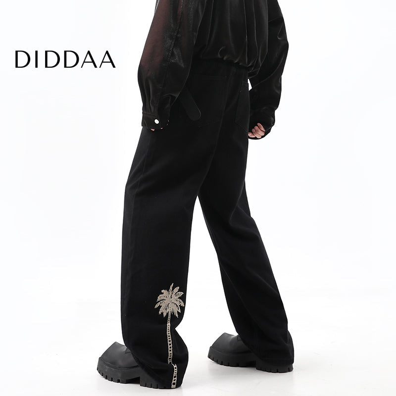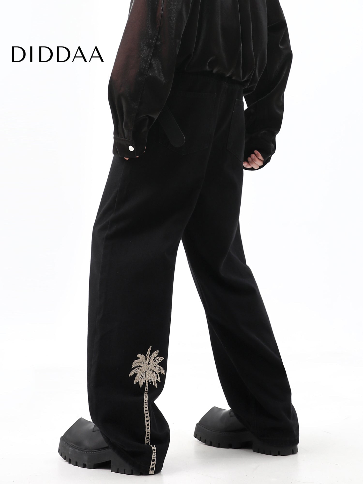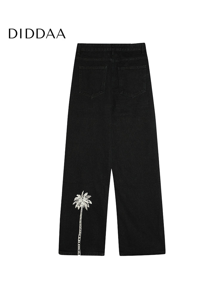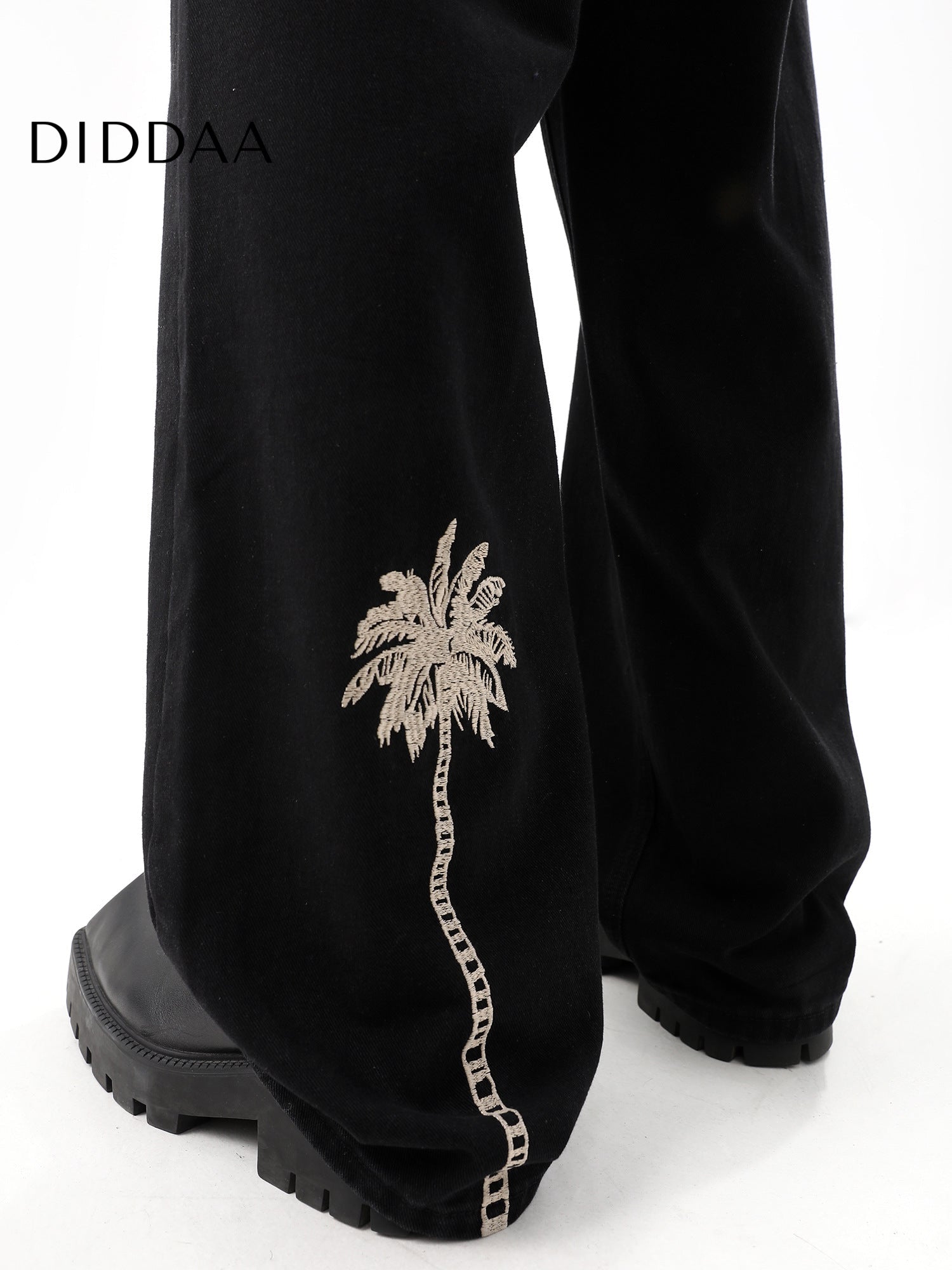 Black Loose Fit Coconut Embroidered Wide Leg Jeans