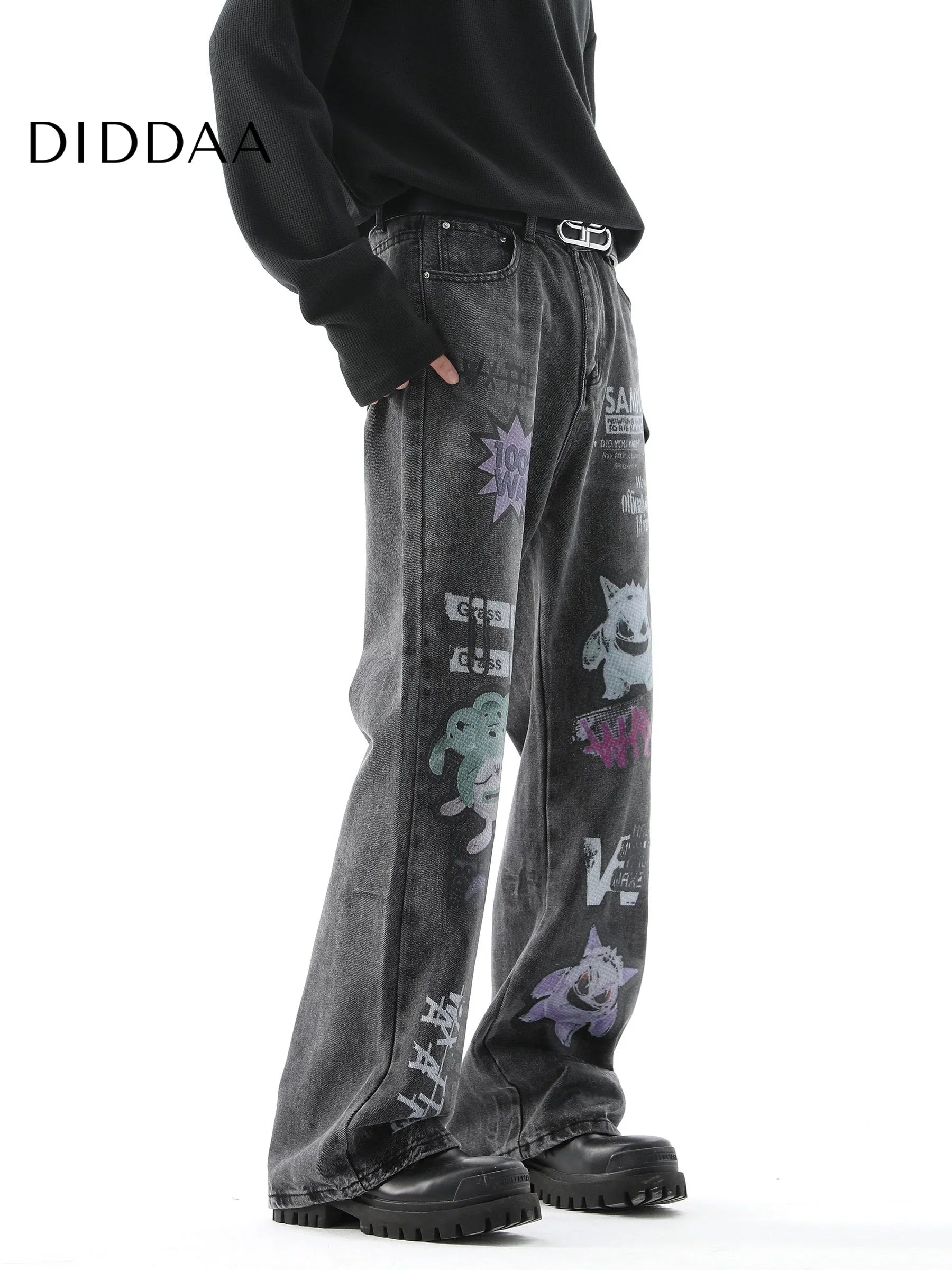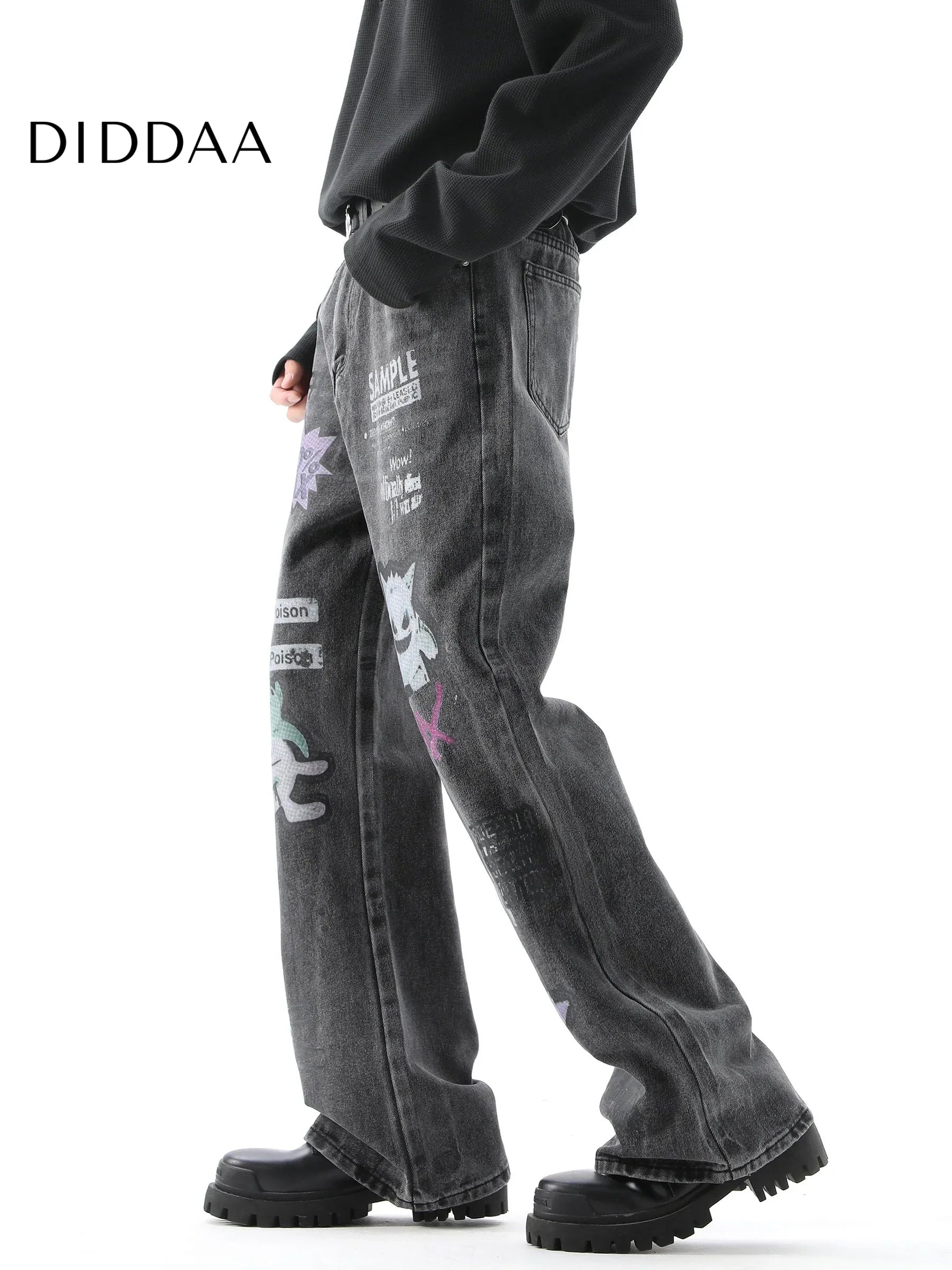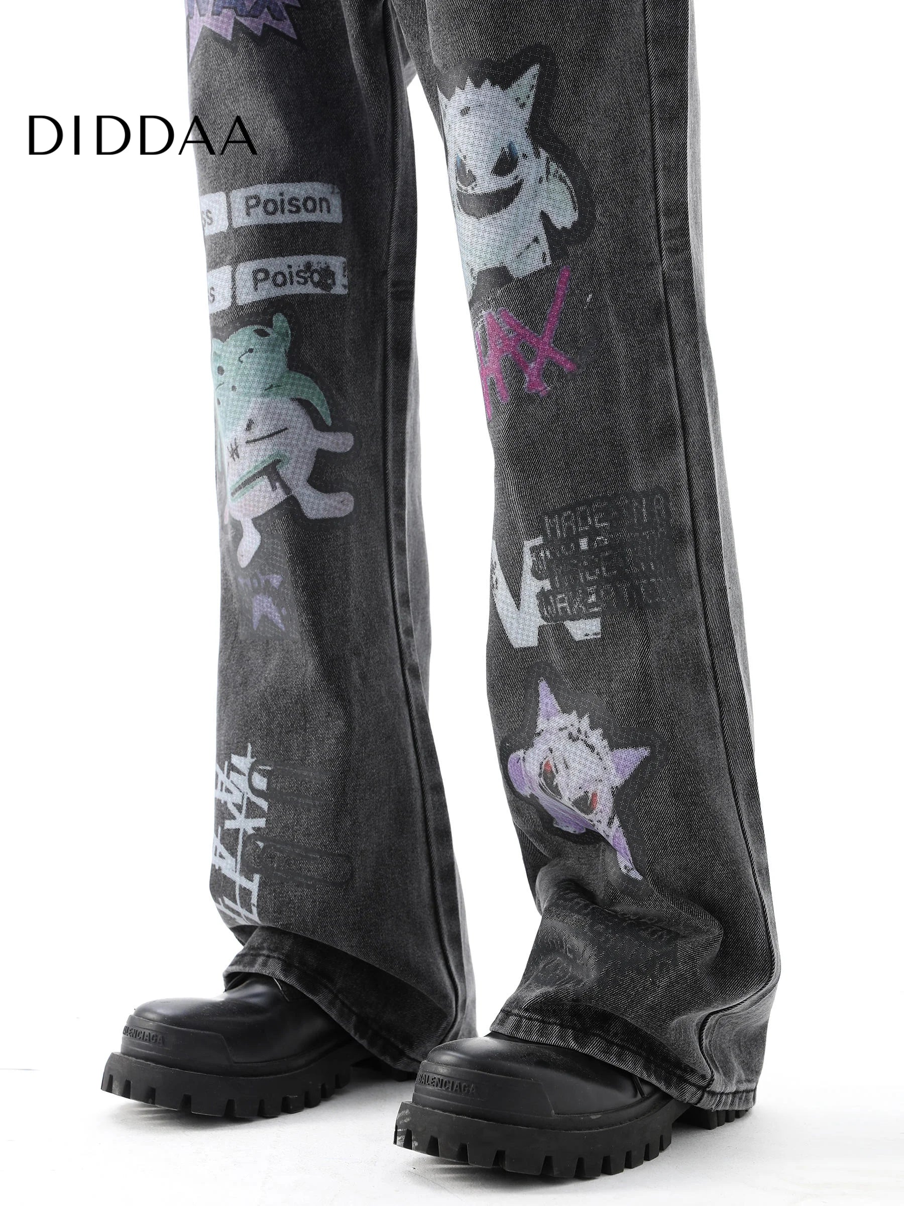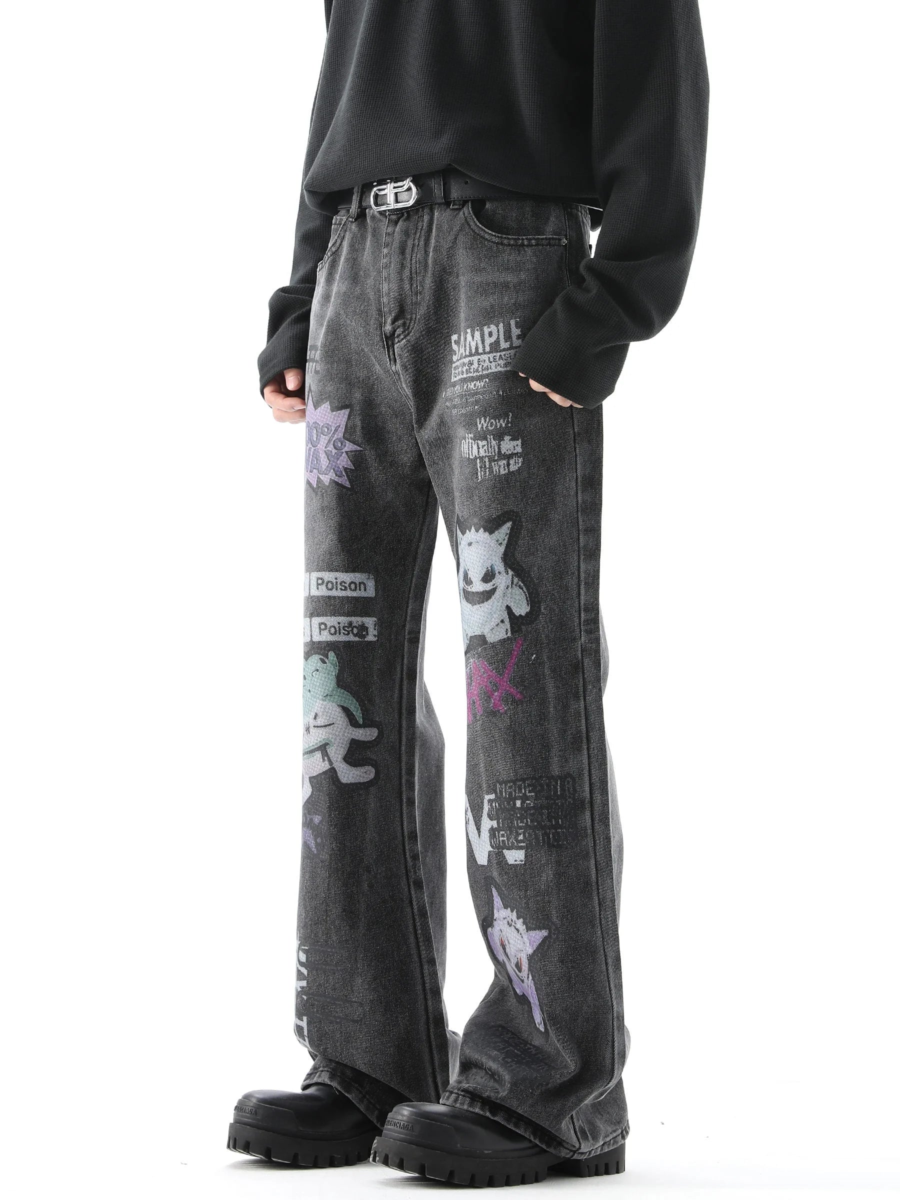 Blue Distressed Cartoon Print Straight Leg Jeans
