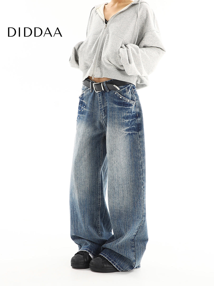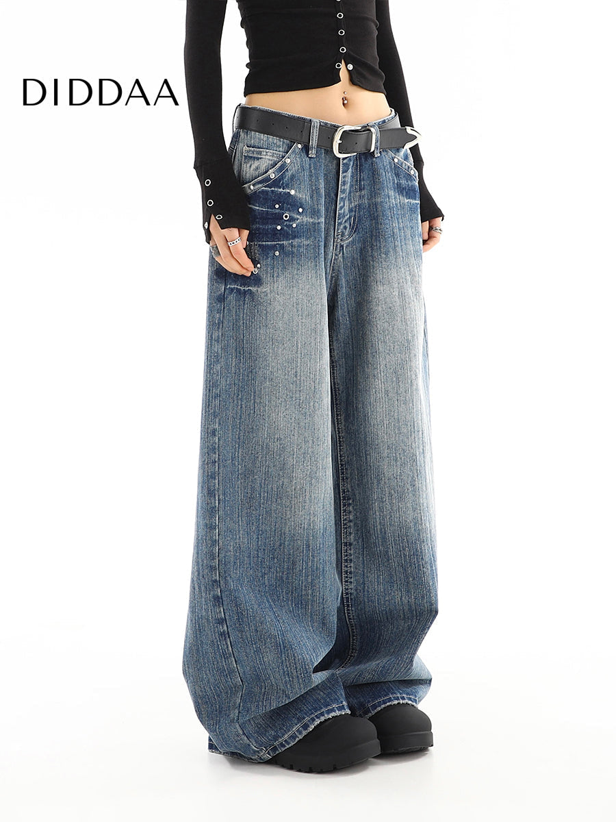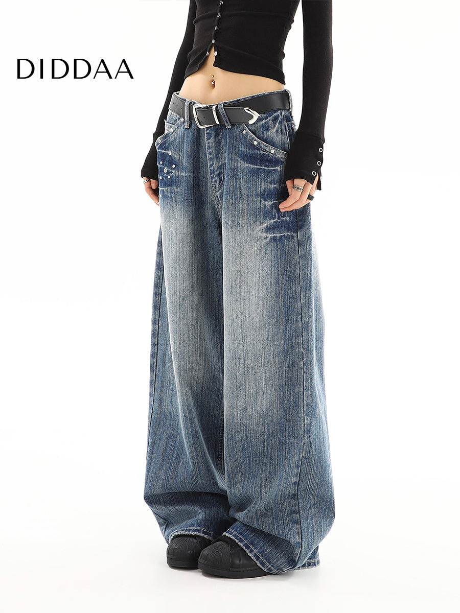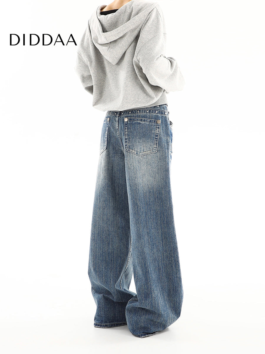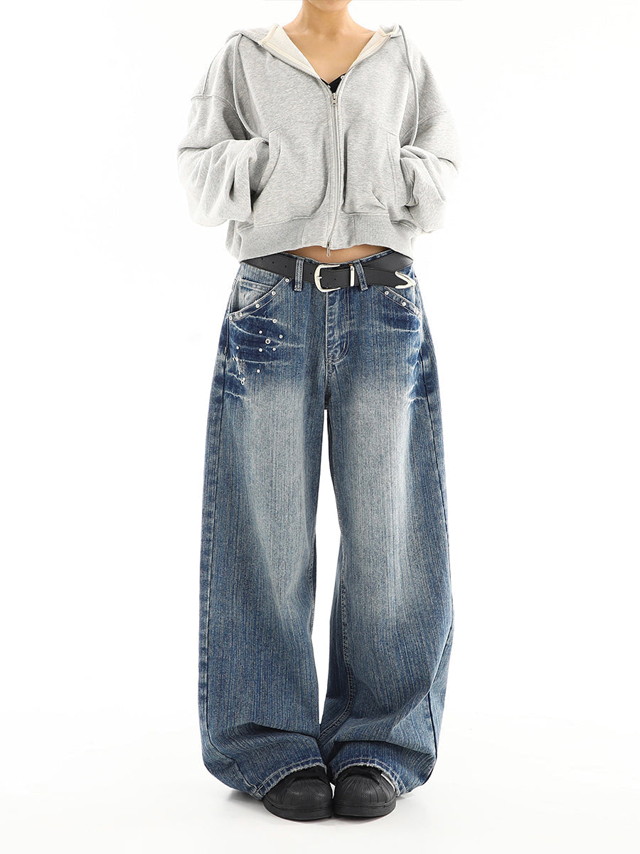 Blue Distressed Low Rise Loose Wide Leg Jeans