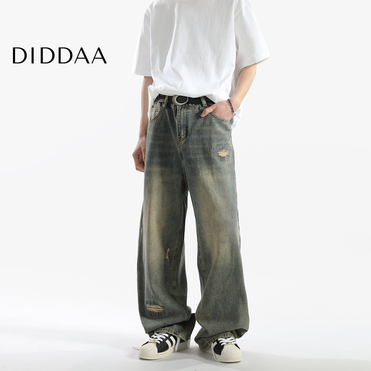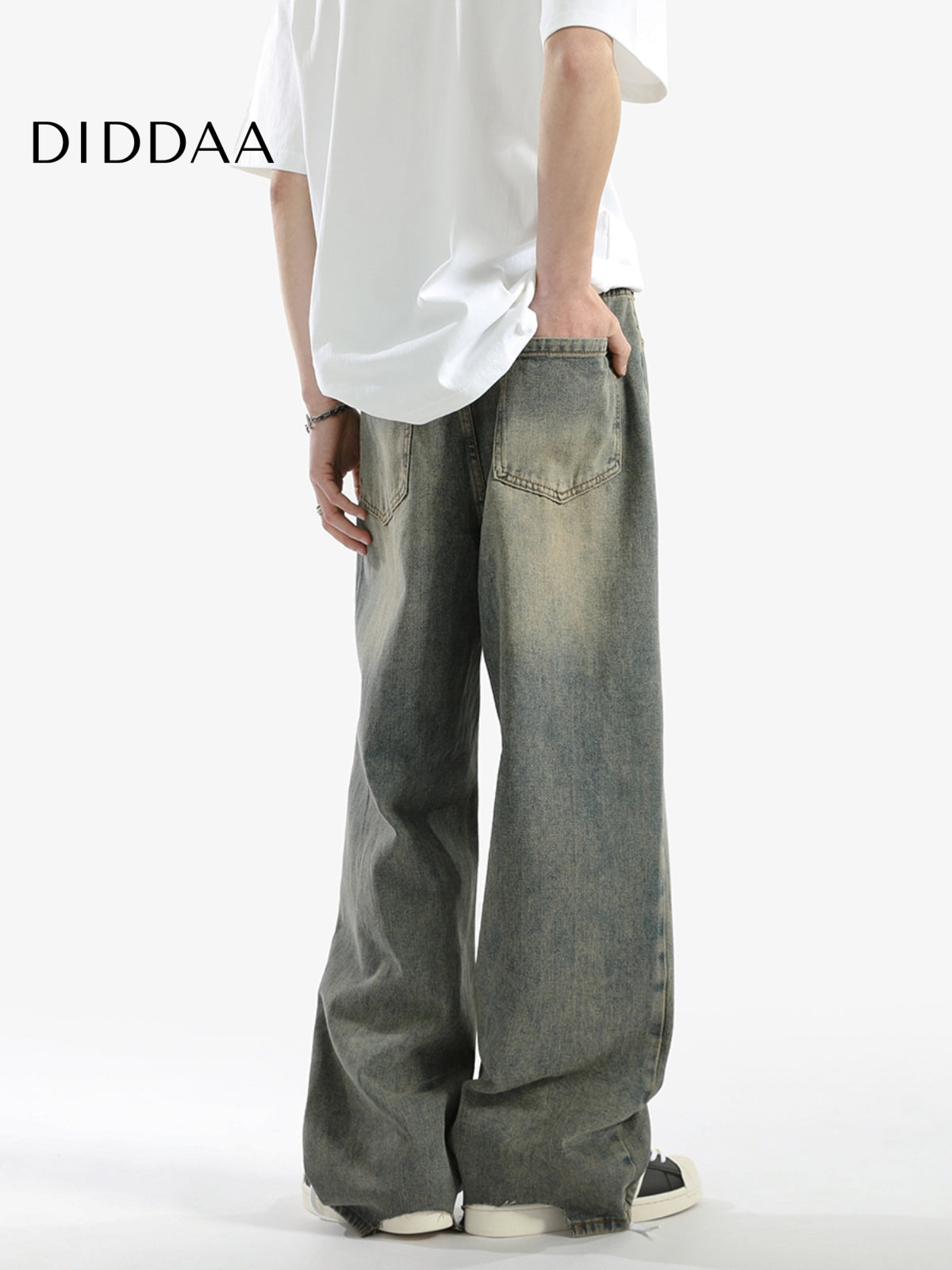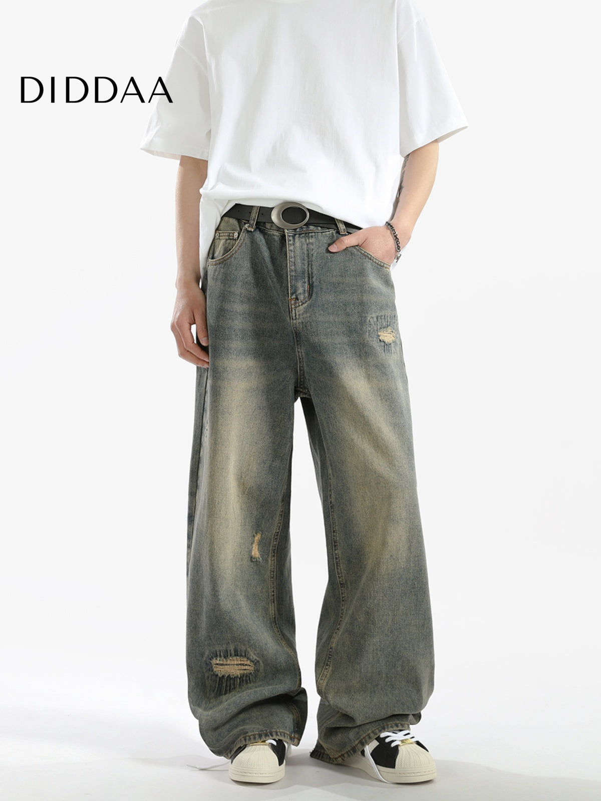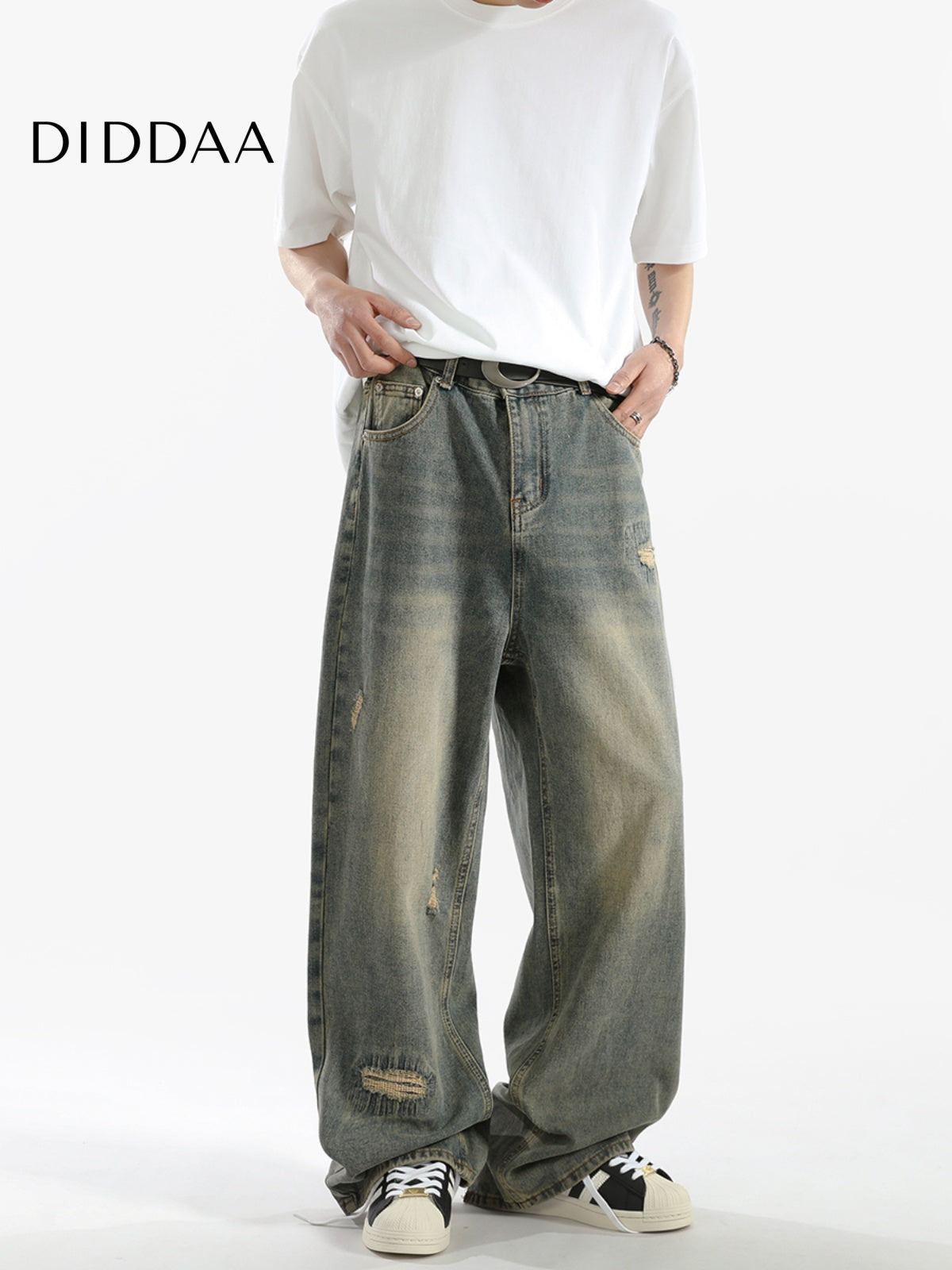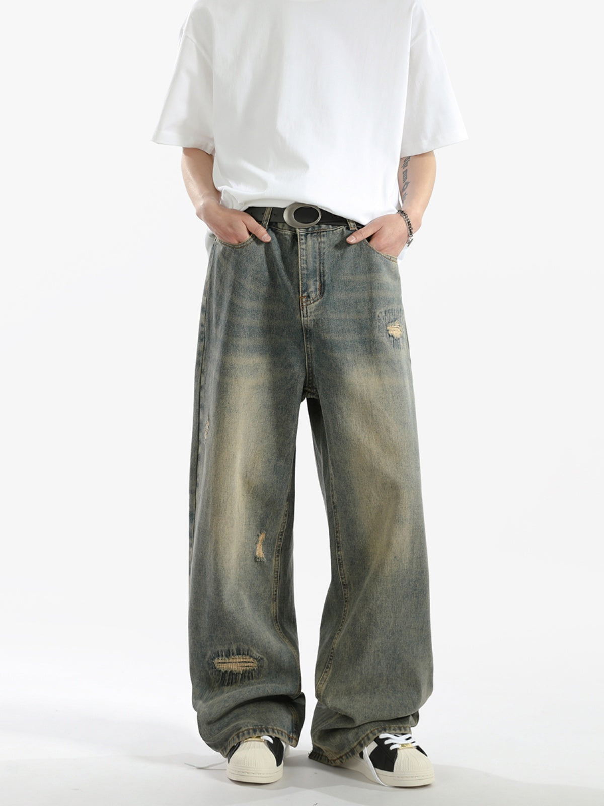 Blue Distressed Vintage Wash Wide-Leg Jeans for Men