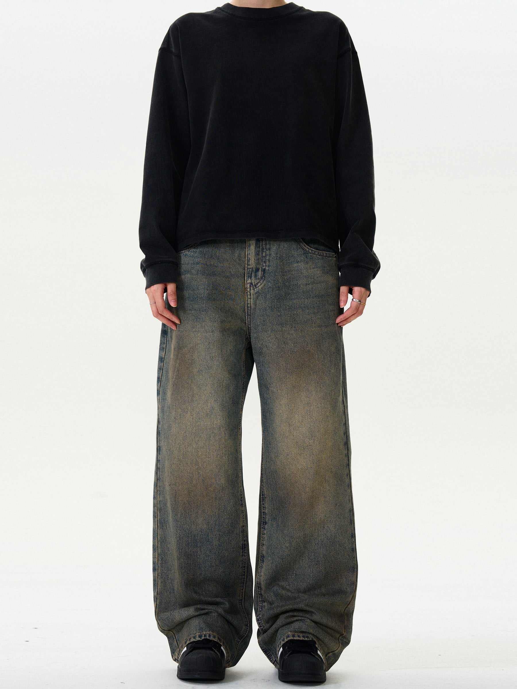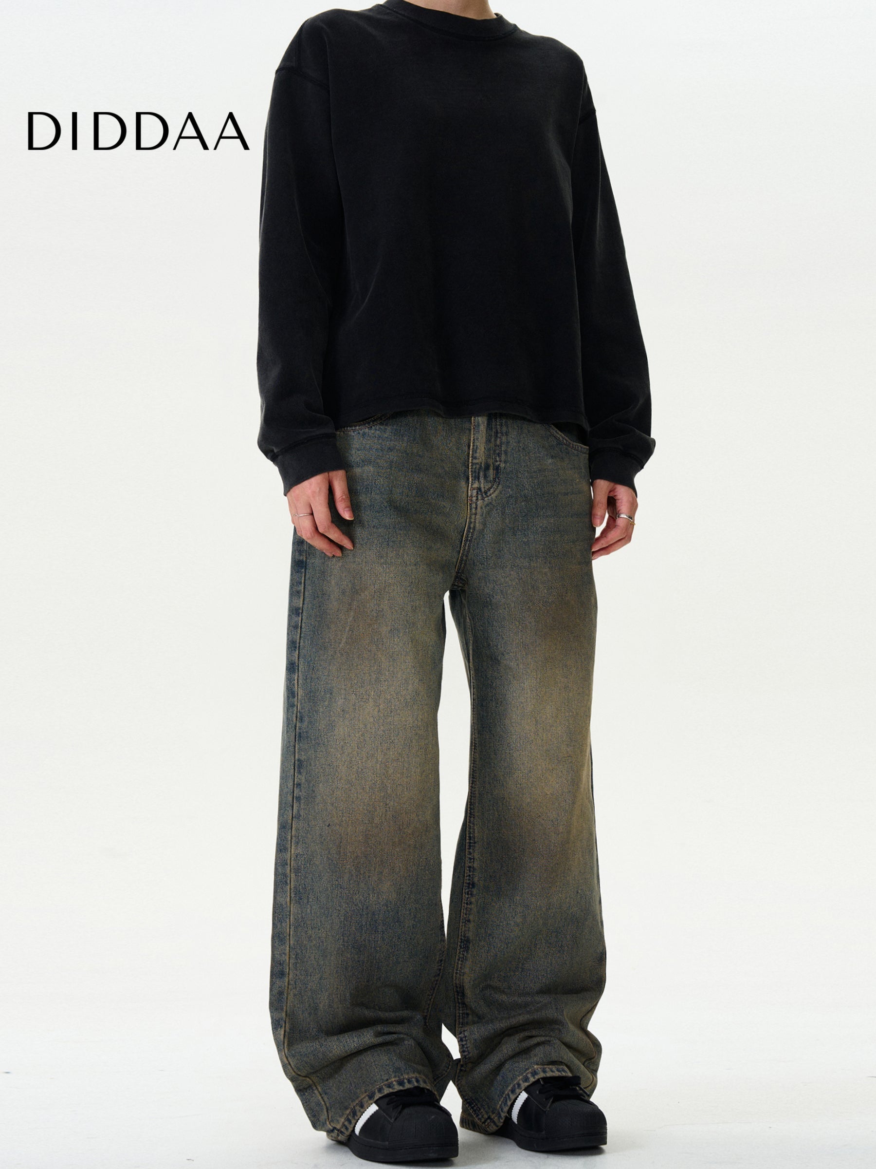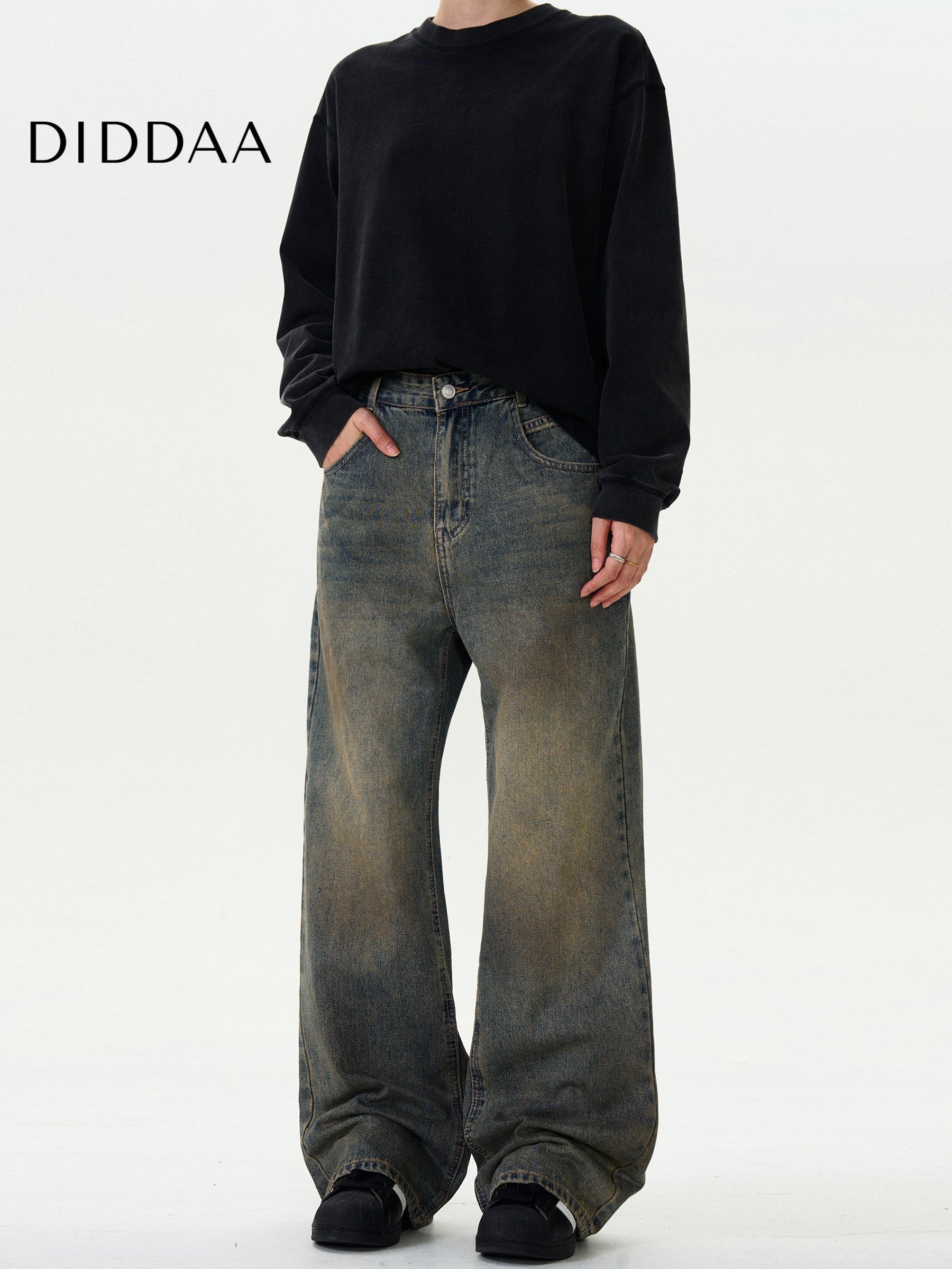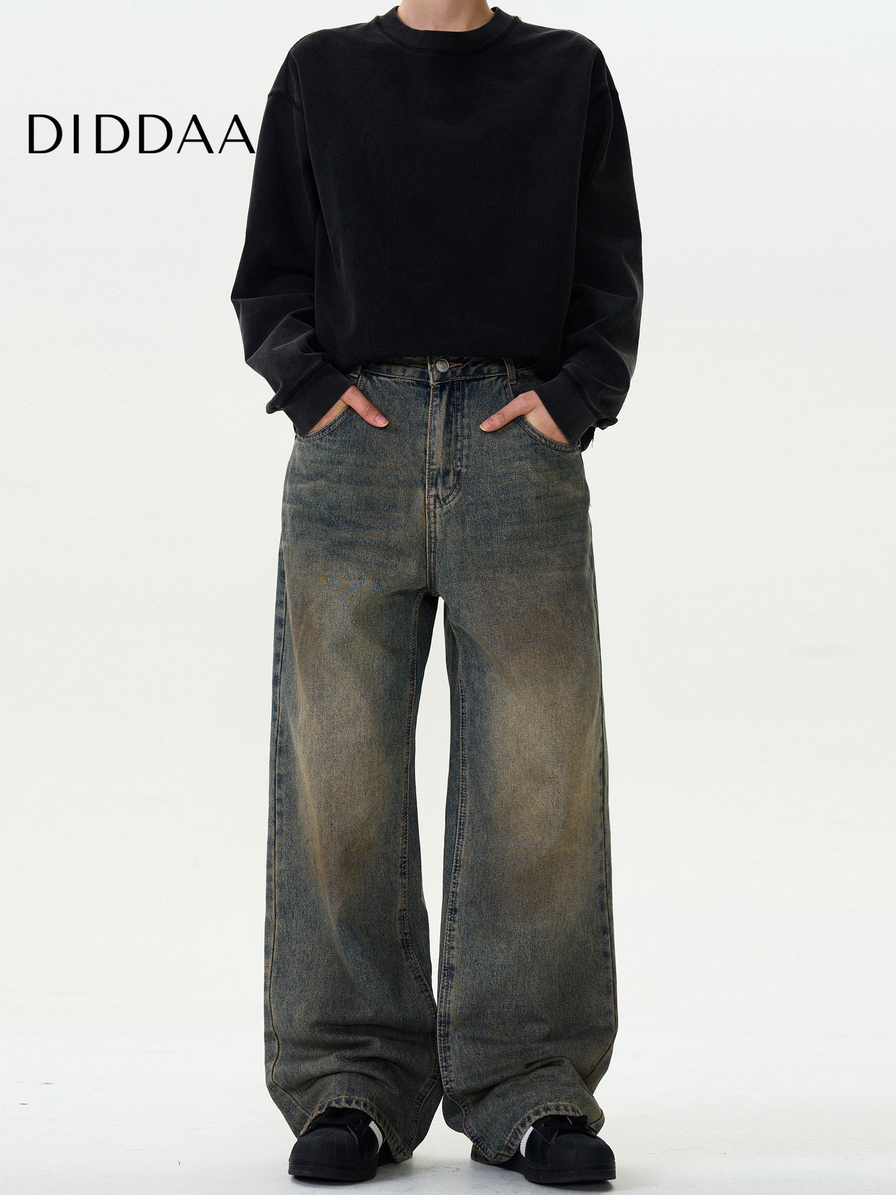 Blue Distressed Vintage Wide-Leg Jeans Unisex Loose Fit