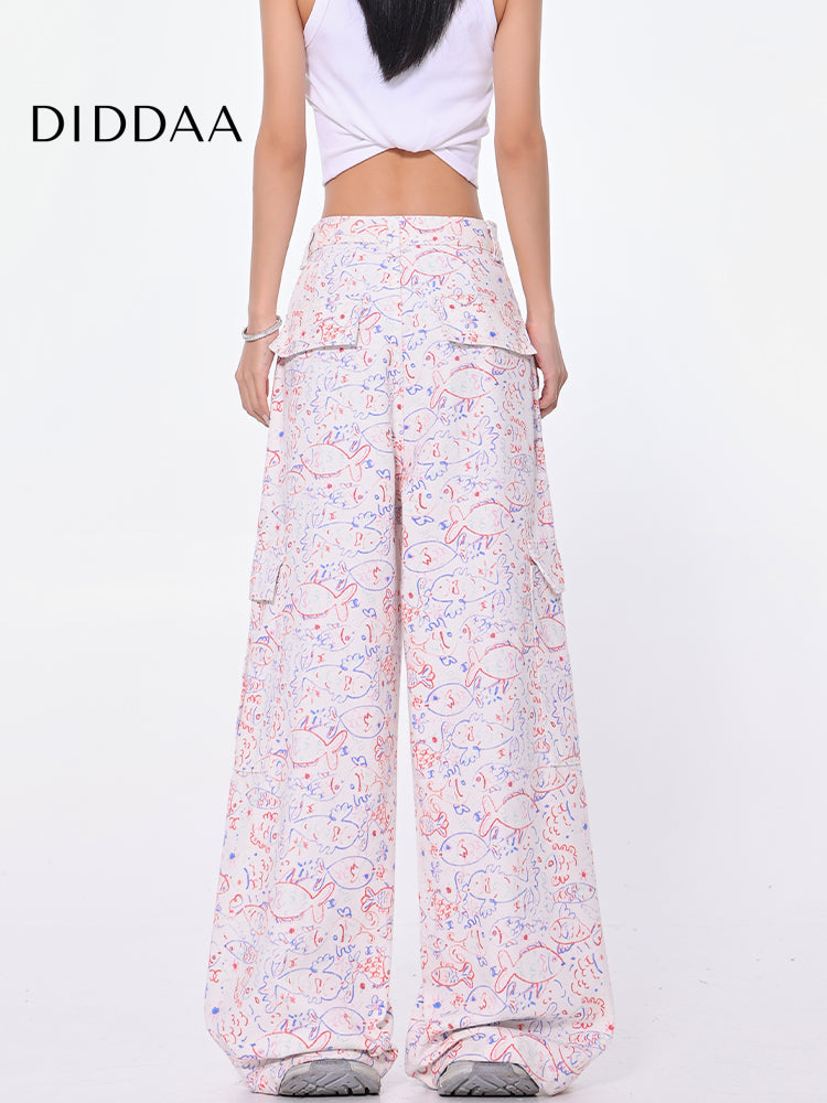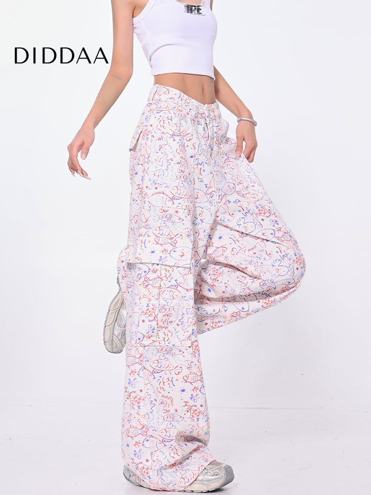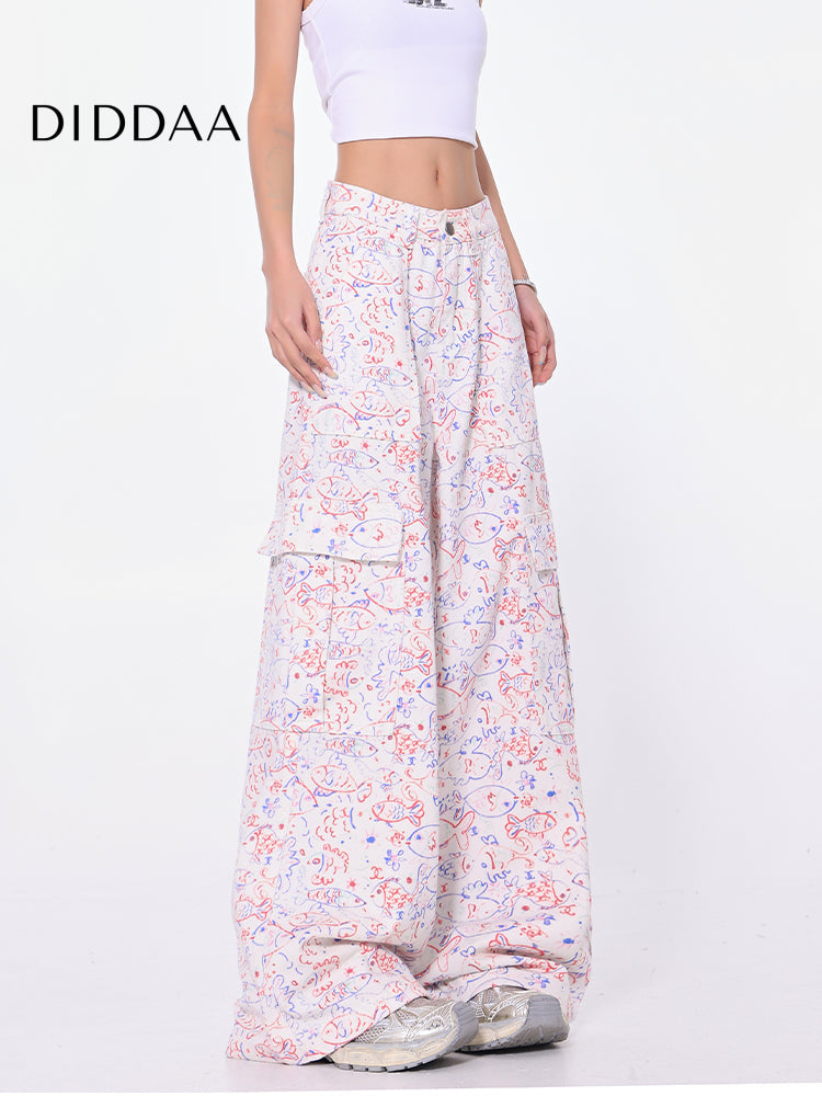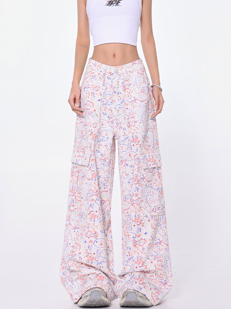 Blue Graffiti Design Wide-Leg Cargo Slacks