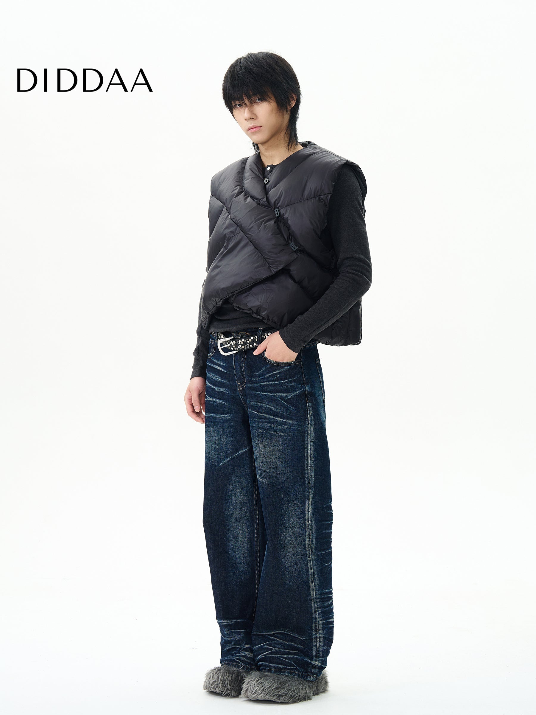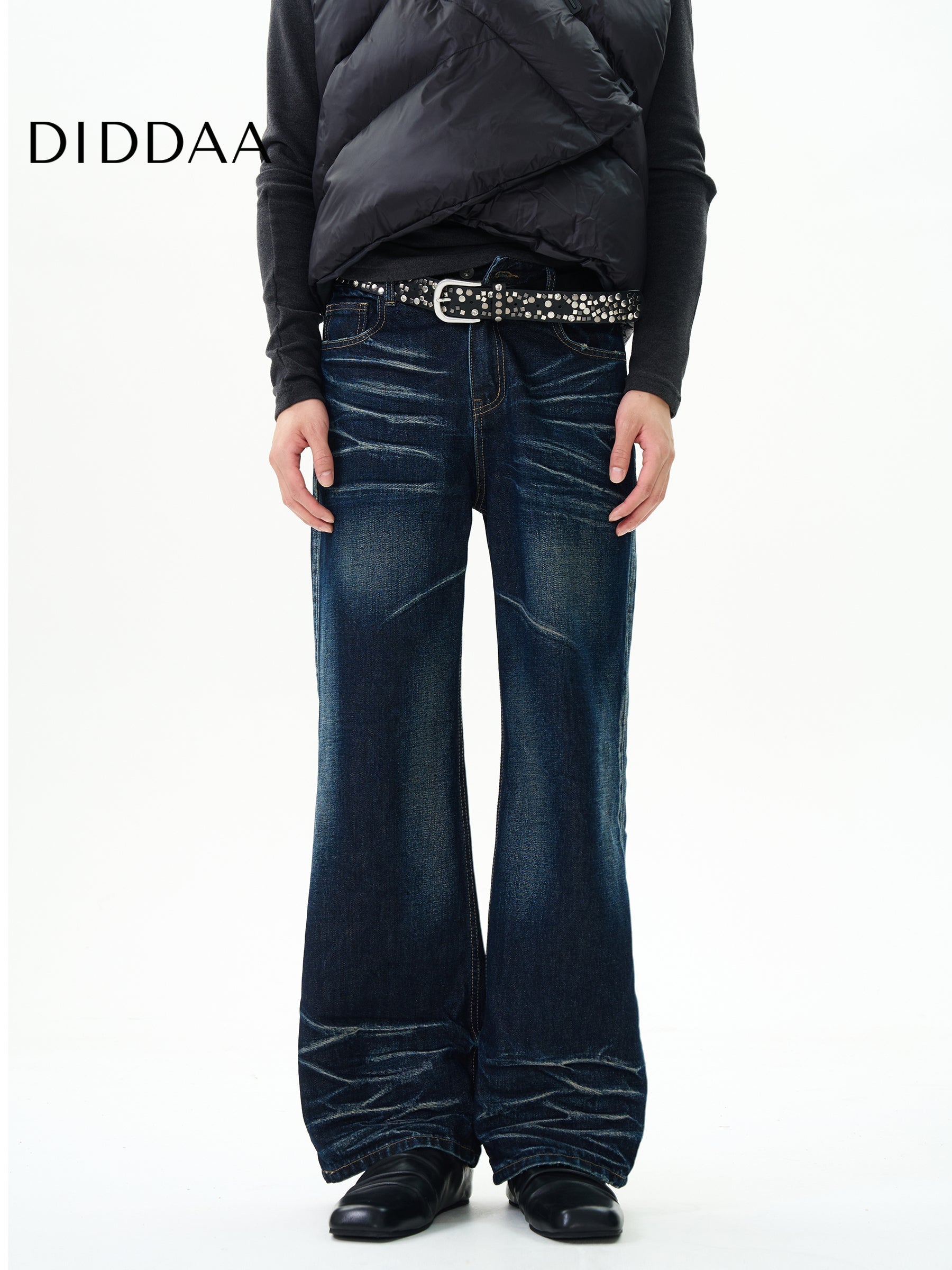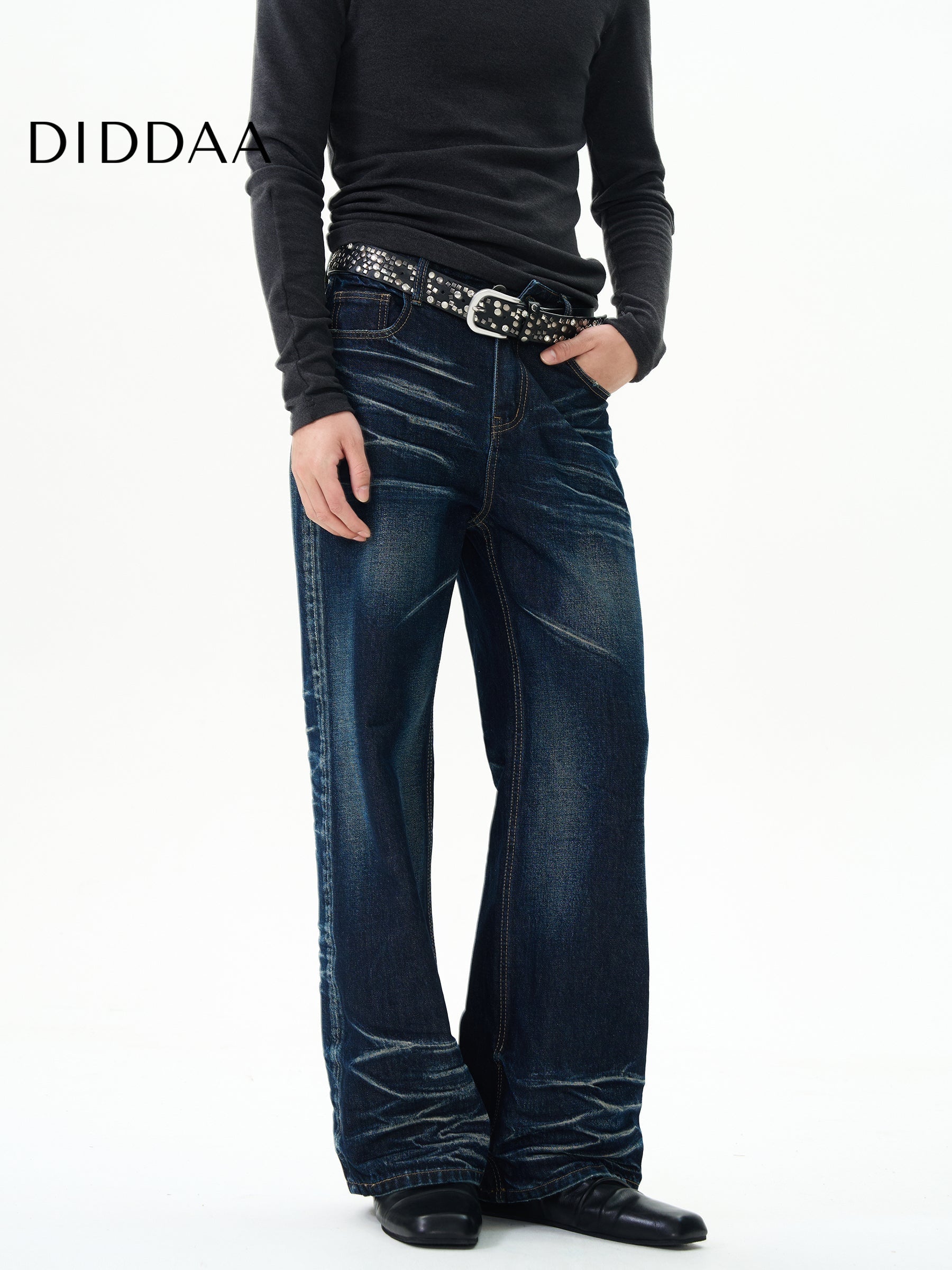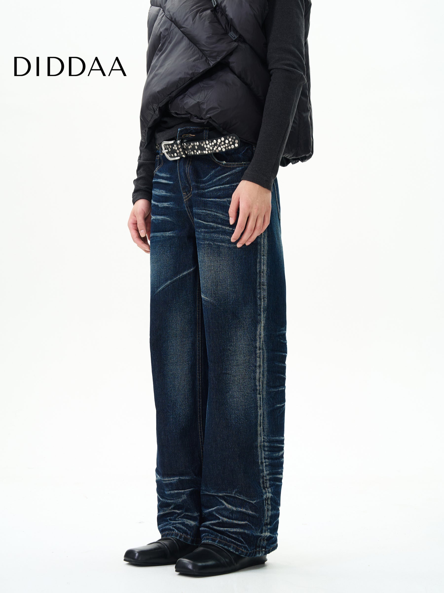 Blue High-Quality Pleated Whiskers Straight-Leg Jeans