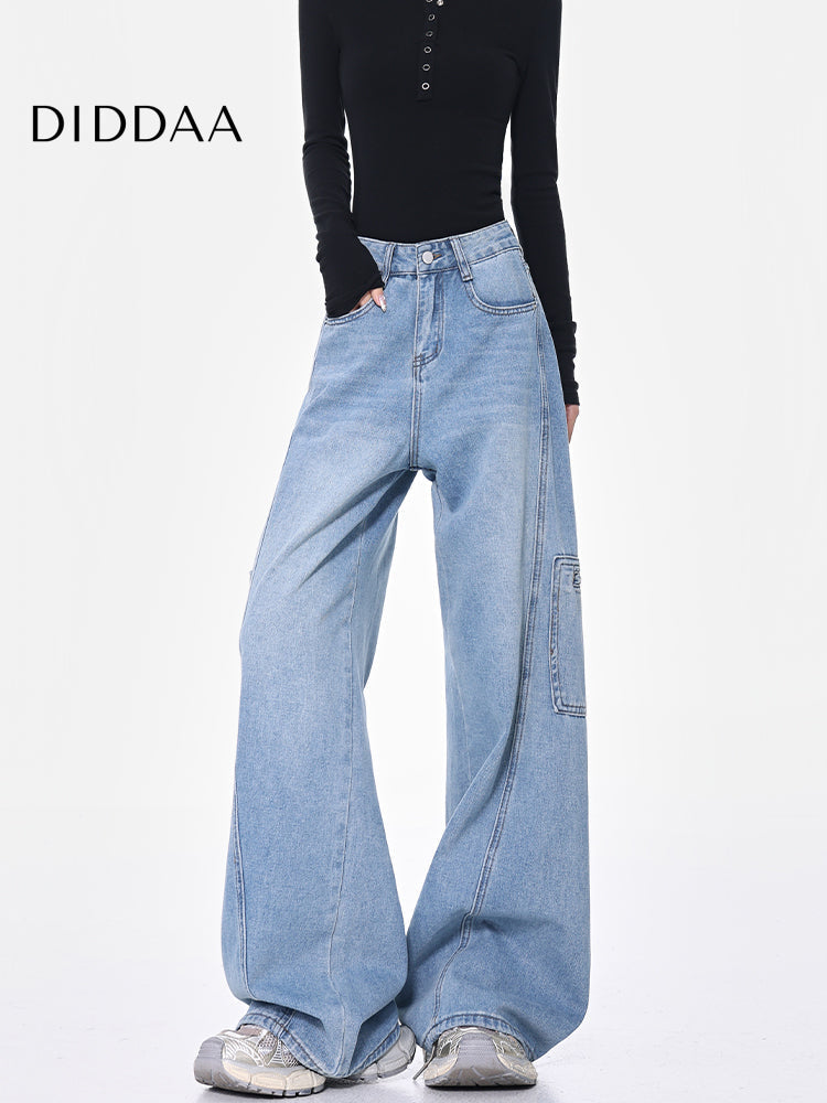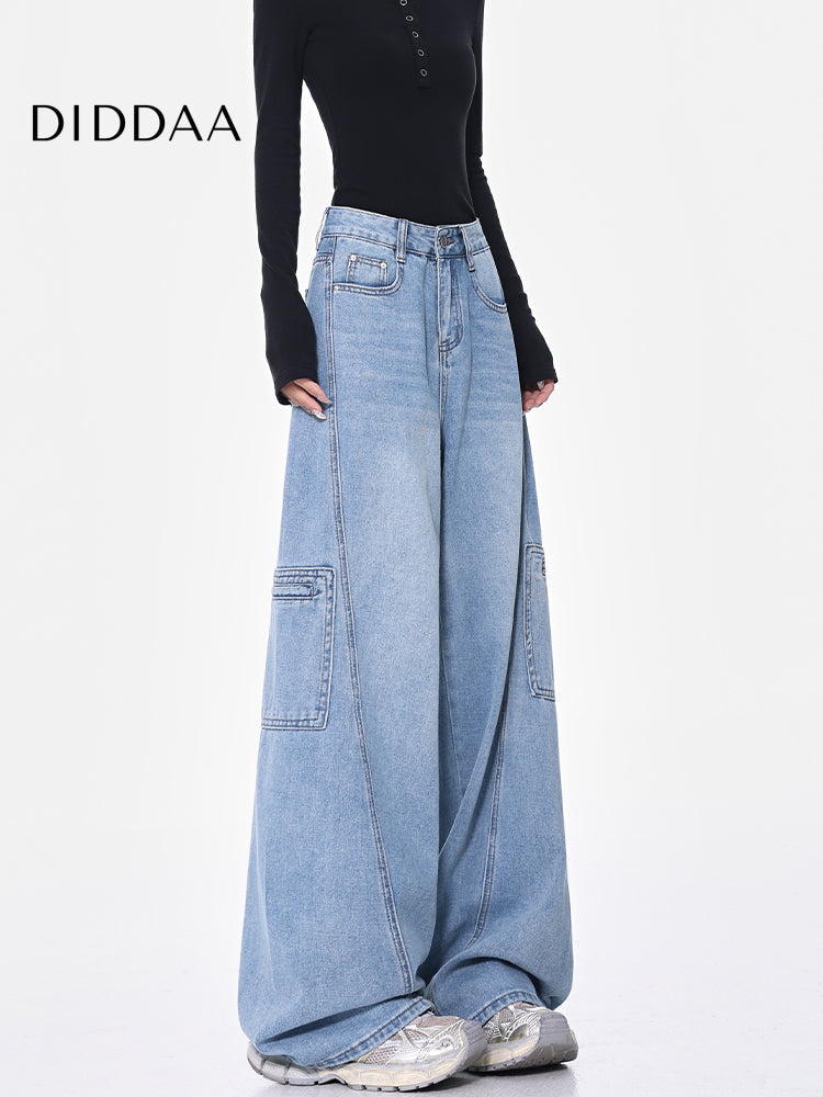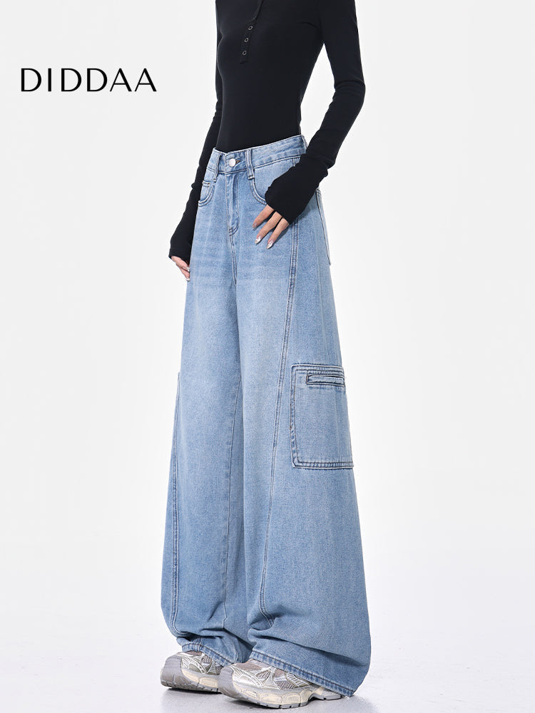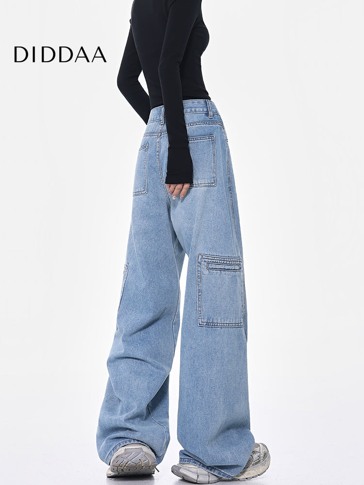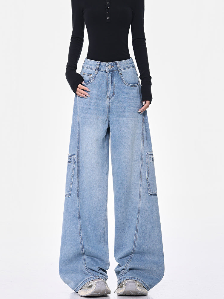 Blue High-Waisted Cargo Wide-Leg Jeans for Women