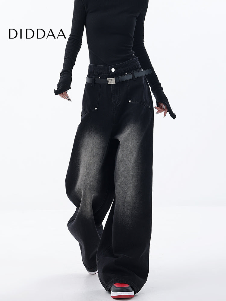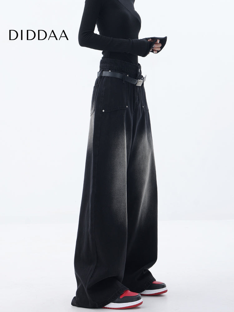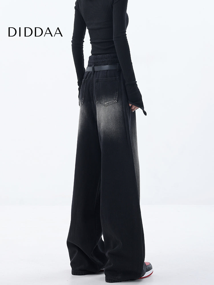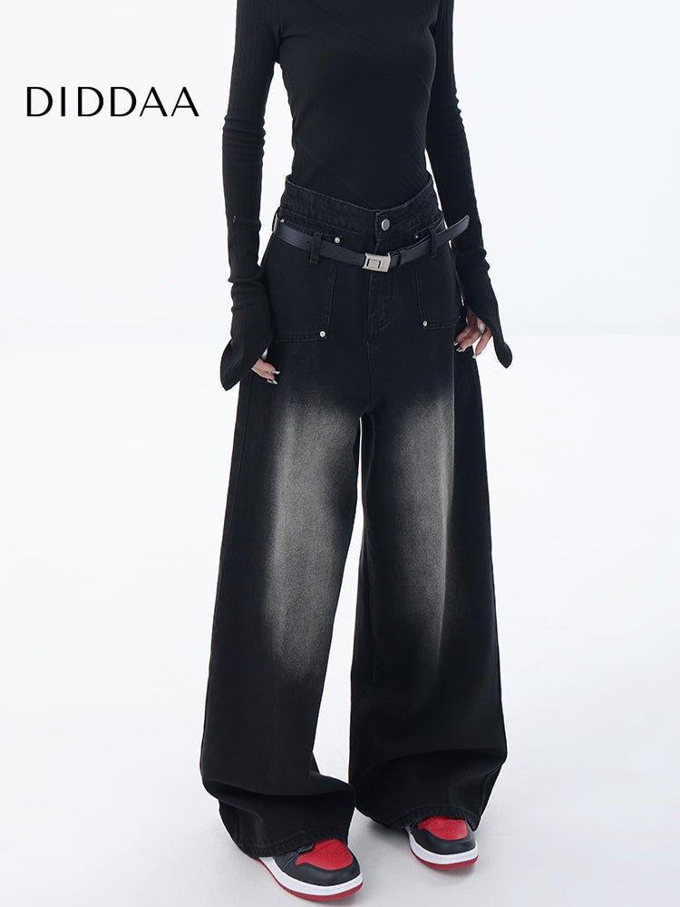 Blue Retro Gradient Loose Wide-Leg Jeans with Pockets