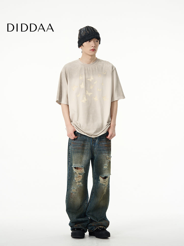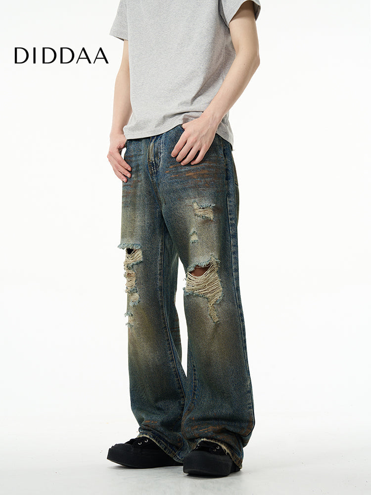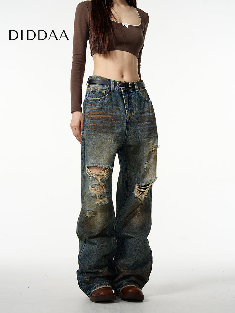 Blue Retro Ripped Straight-Leg Jeans for Couples