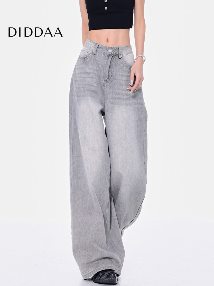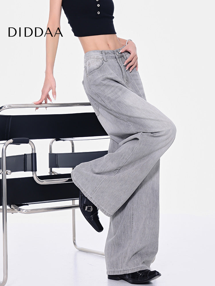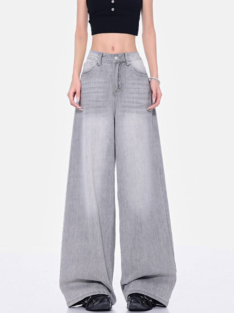 Grey High Waist Wide-Leg Jeans with Retro Wash