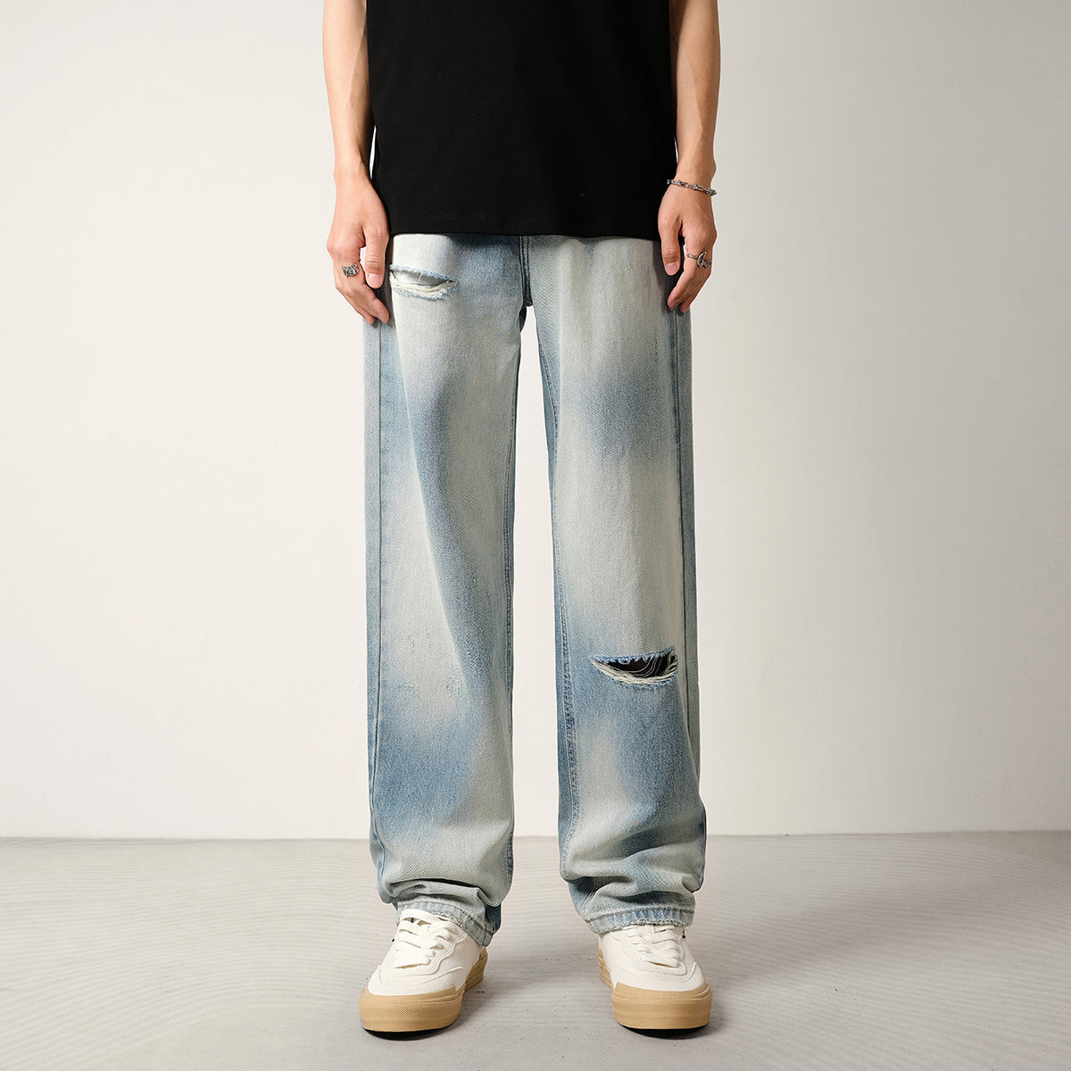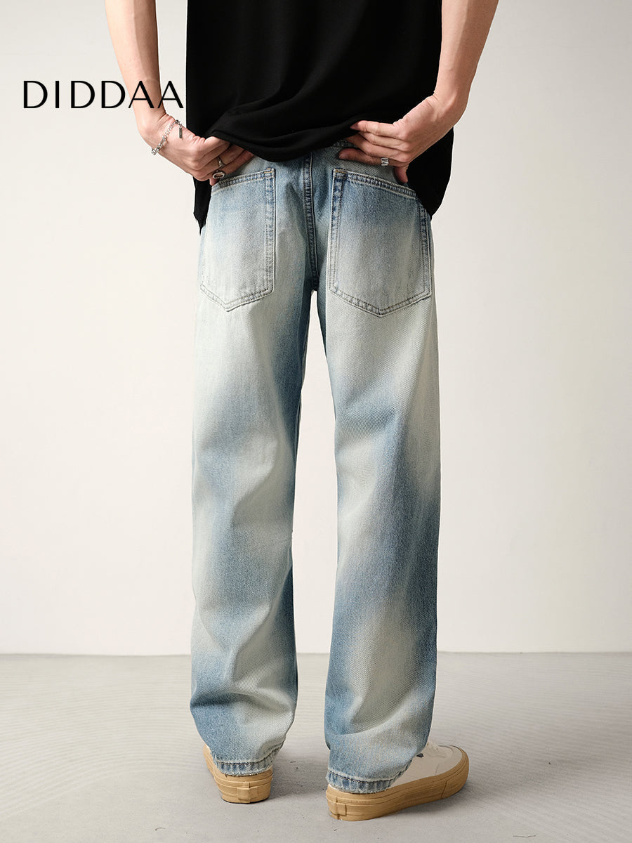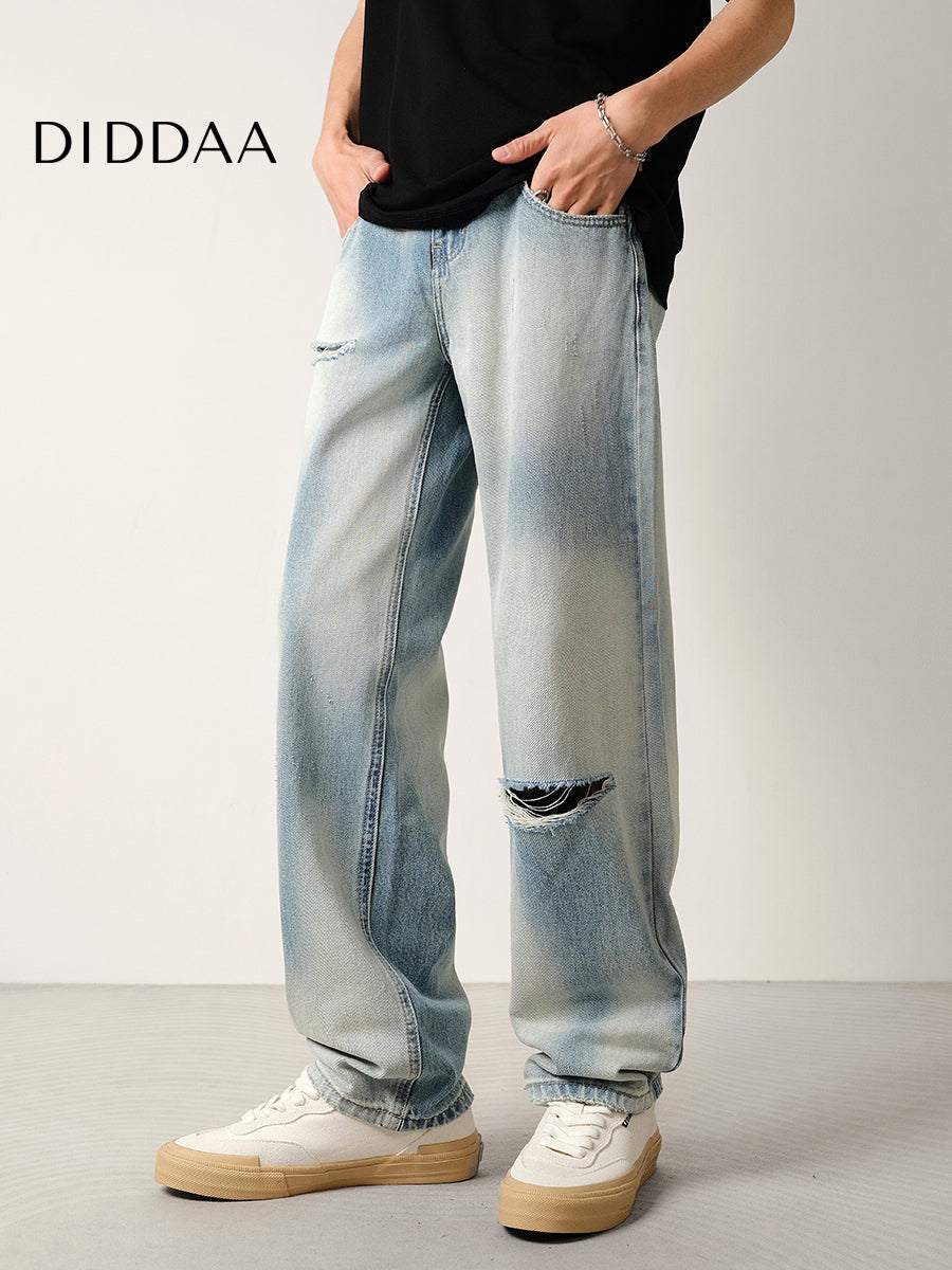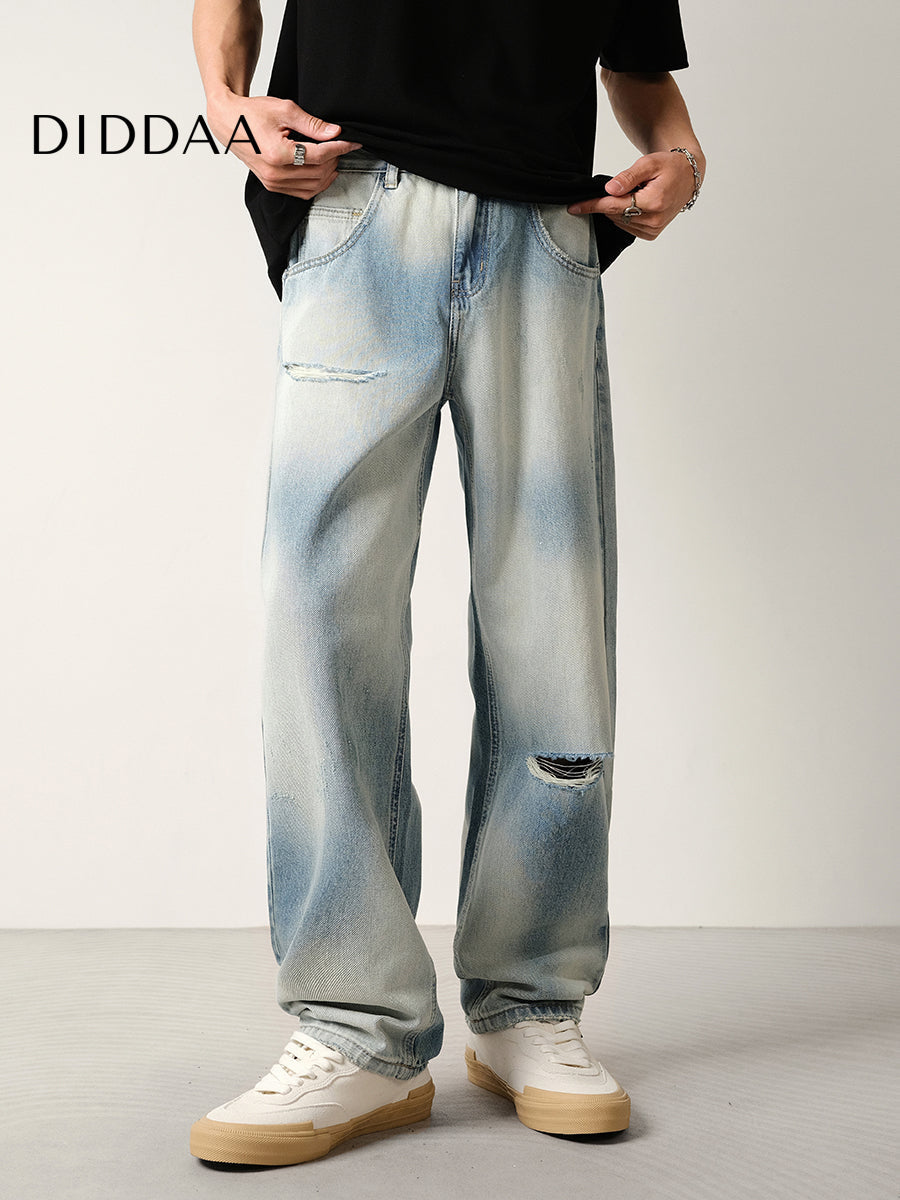 Light Blue Gradient Ripped Jeans Men's Loose Drape Pants