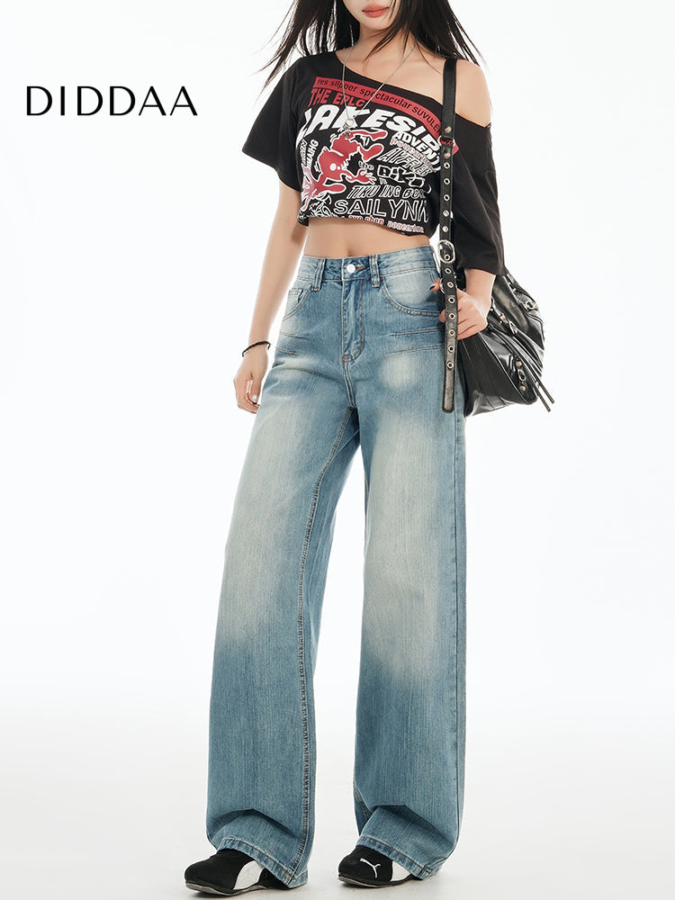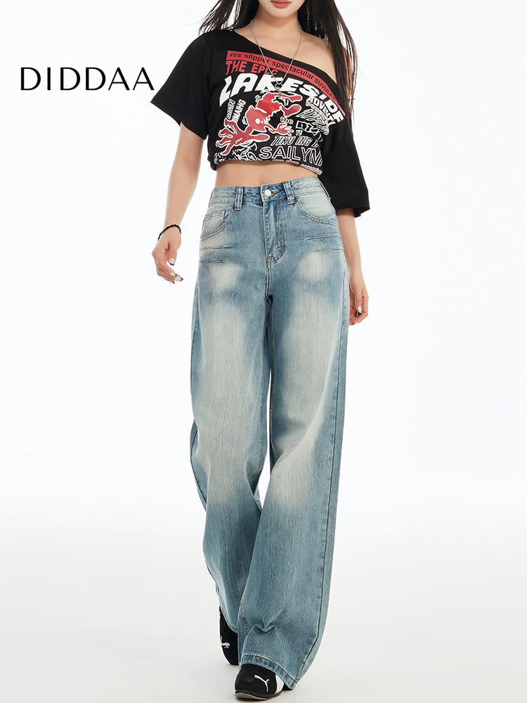 Light Blue High-Waisted Embroidered Wide-Leg Jeans