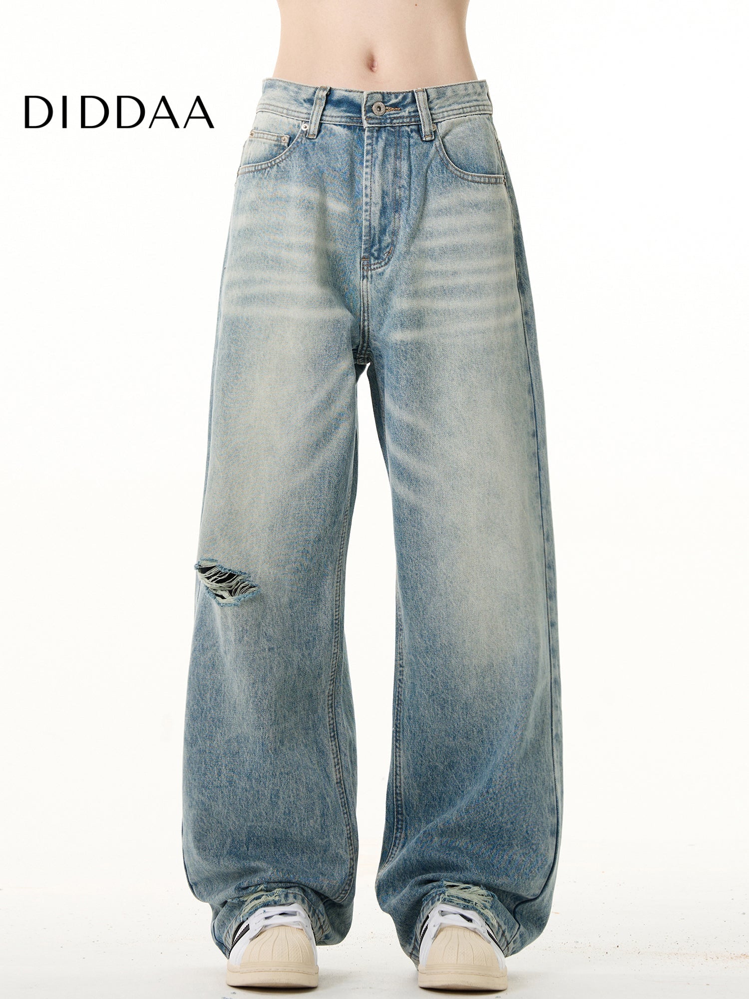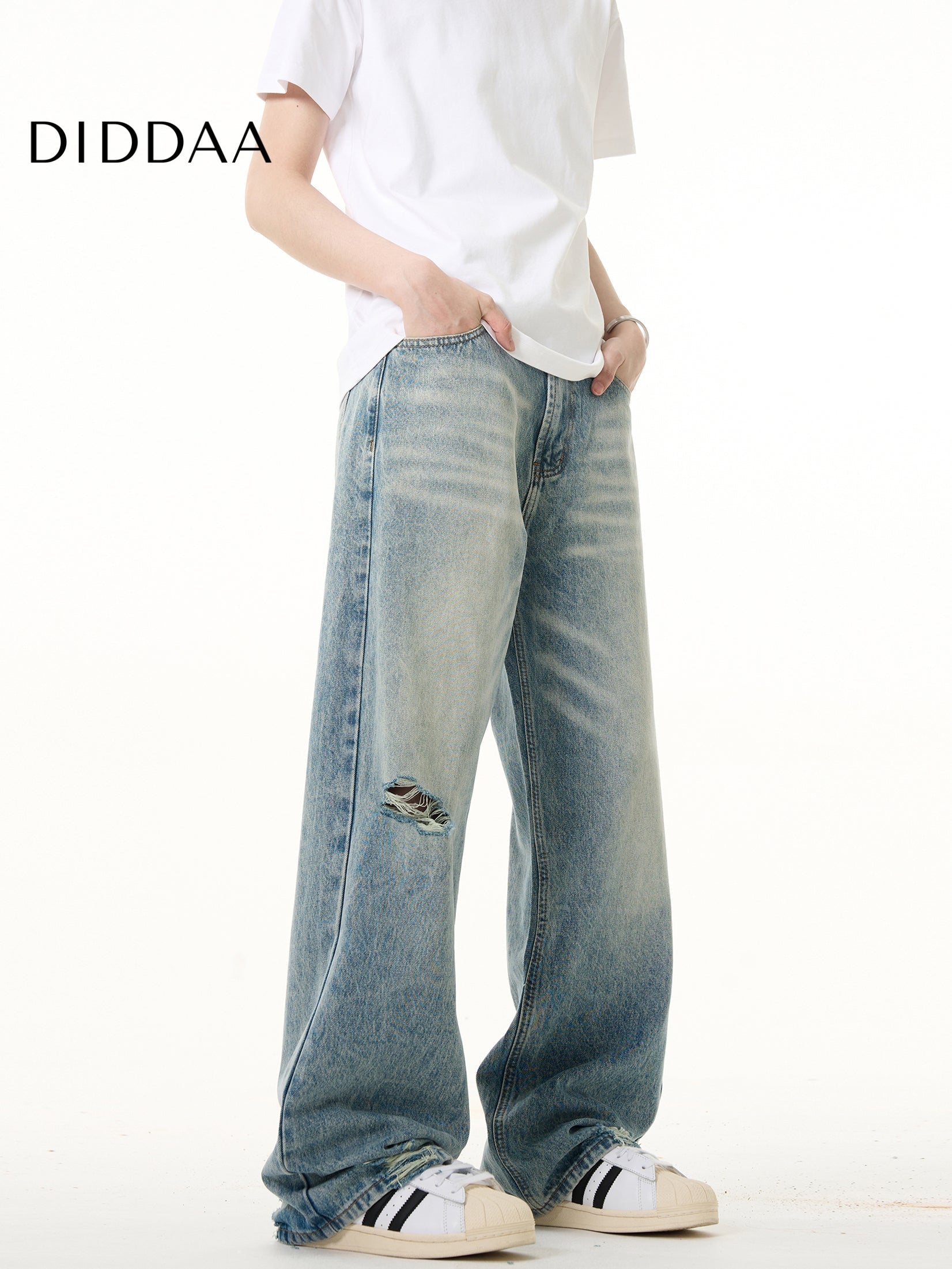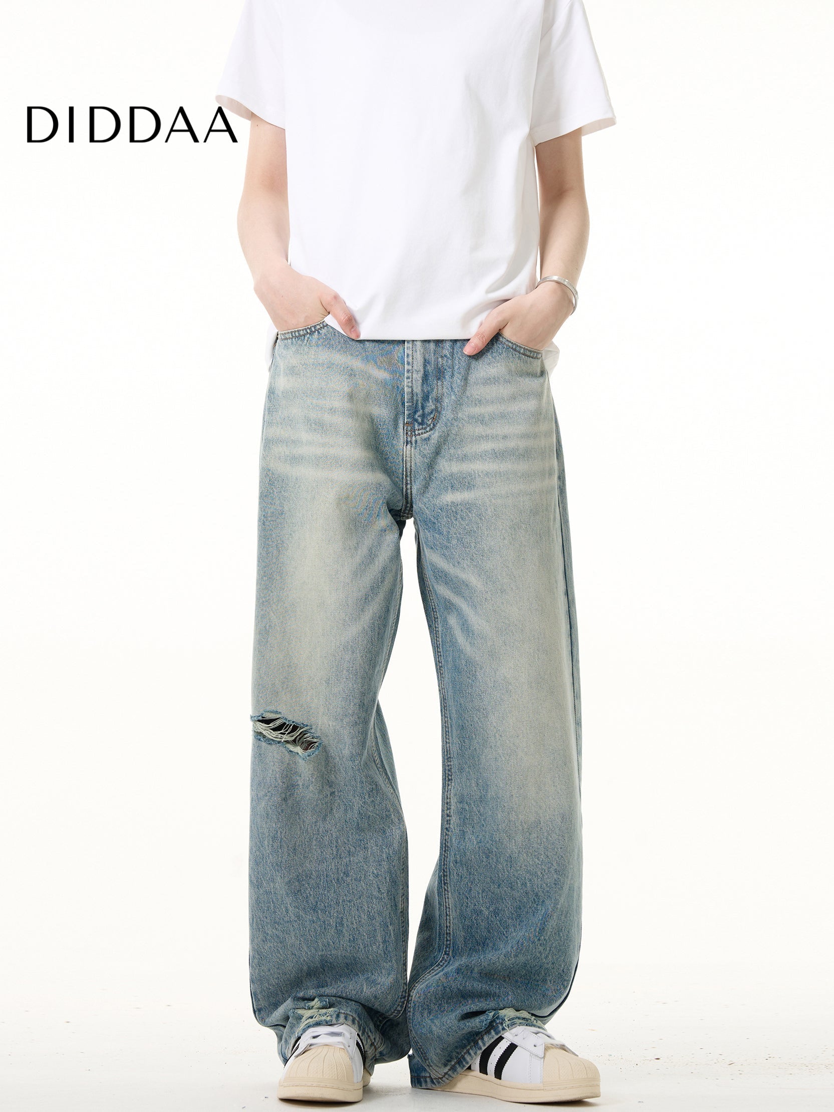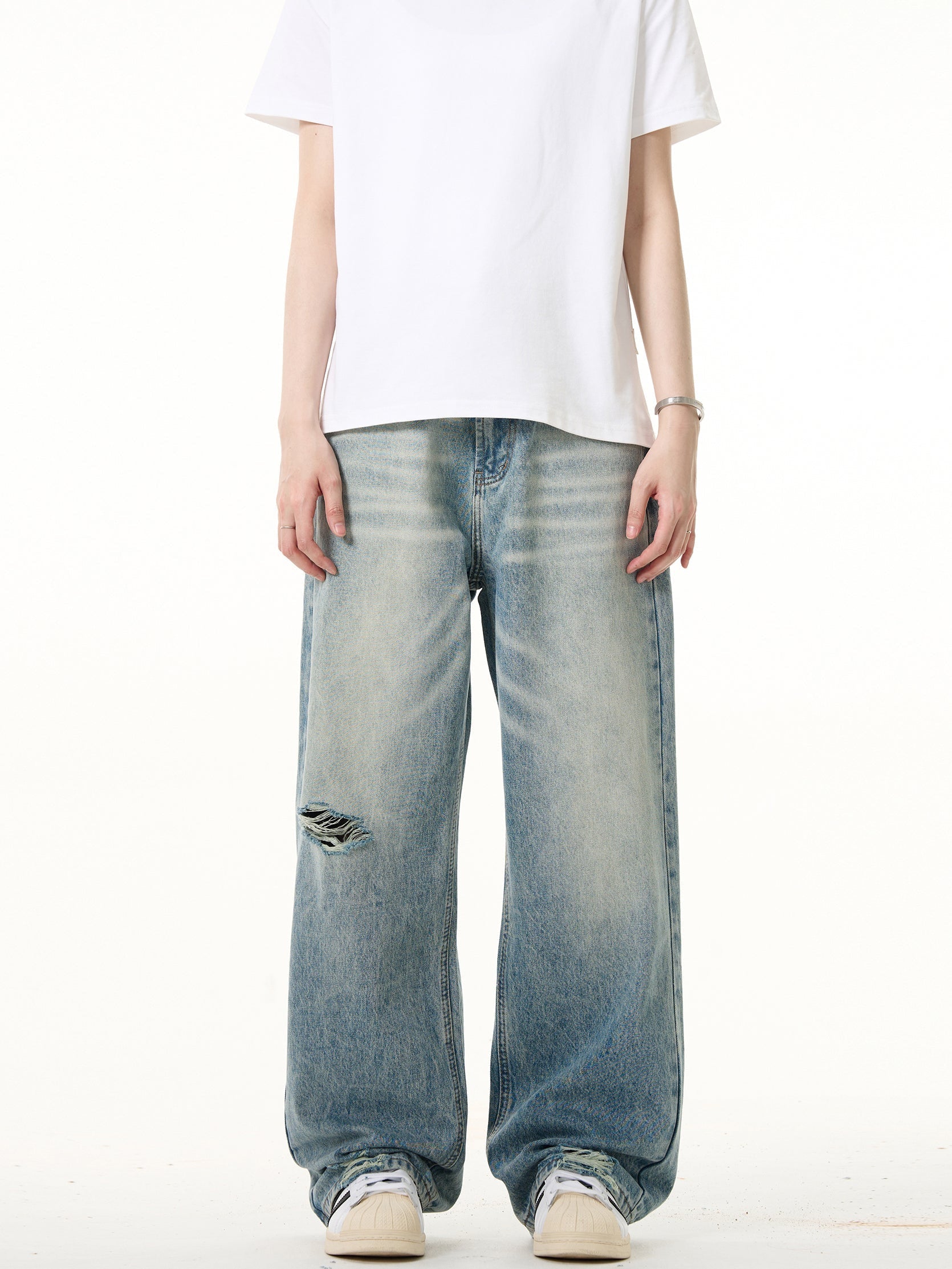 Light Blue Ripped Straight Leg Jeans for Men and Women