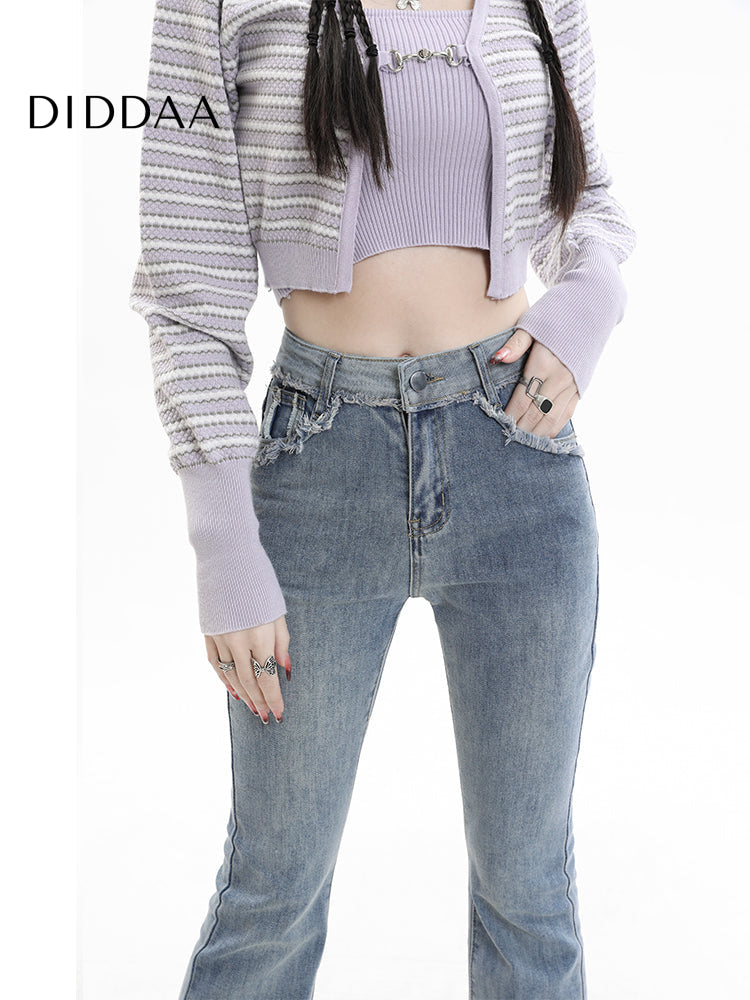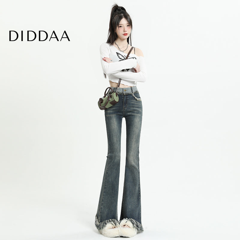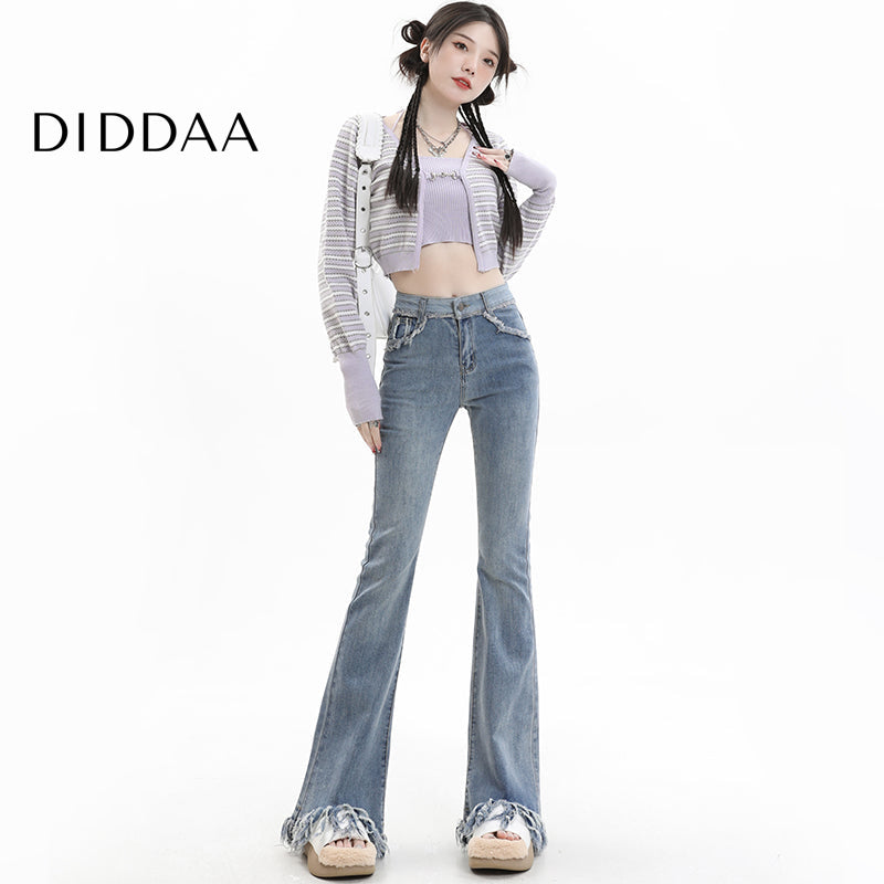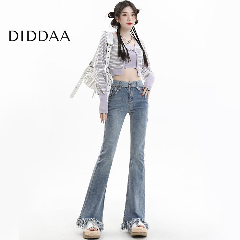 Light Blue Tassel Raw Edge Flared Jeans