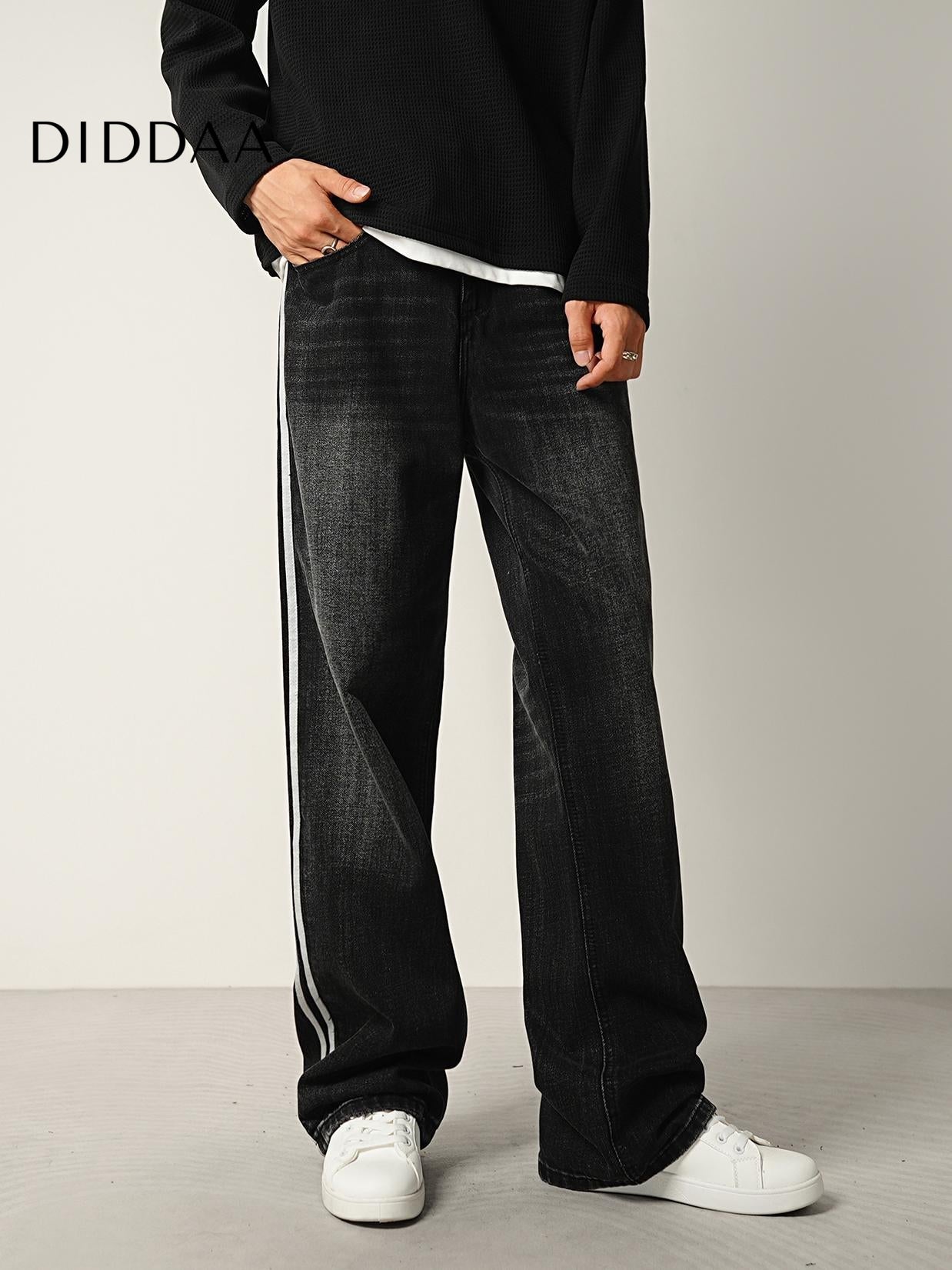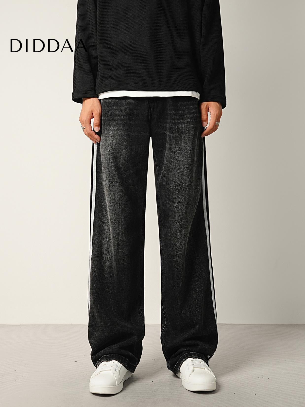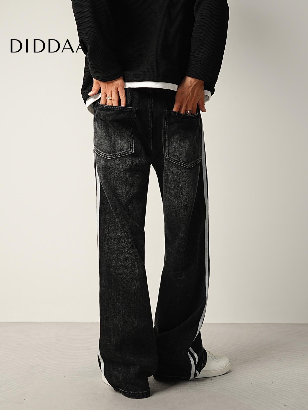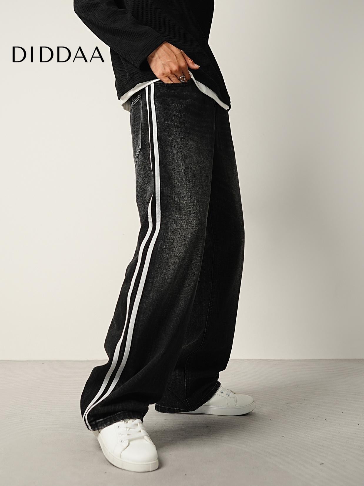Navy Retro Panelled Side-Striped Loose Wide-Leg Jeans