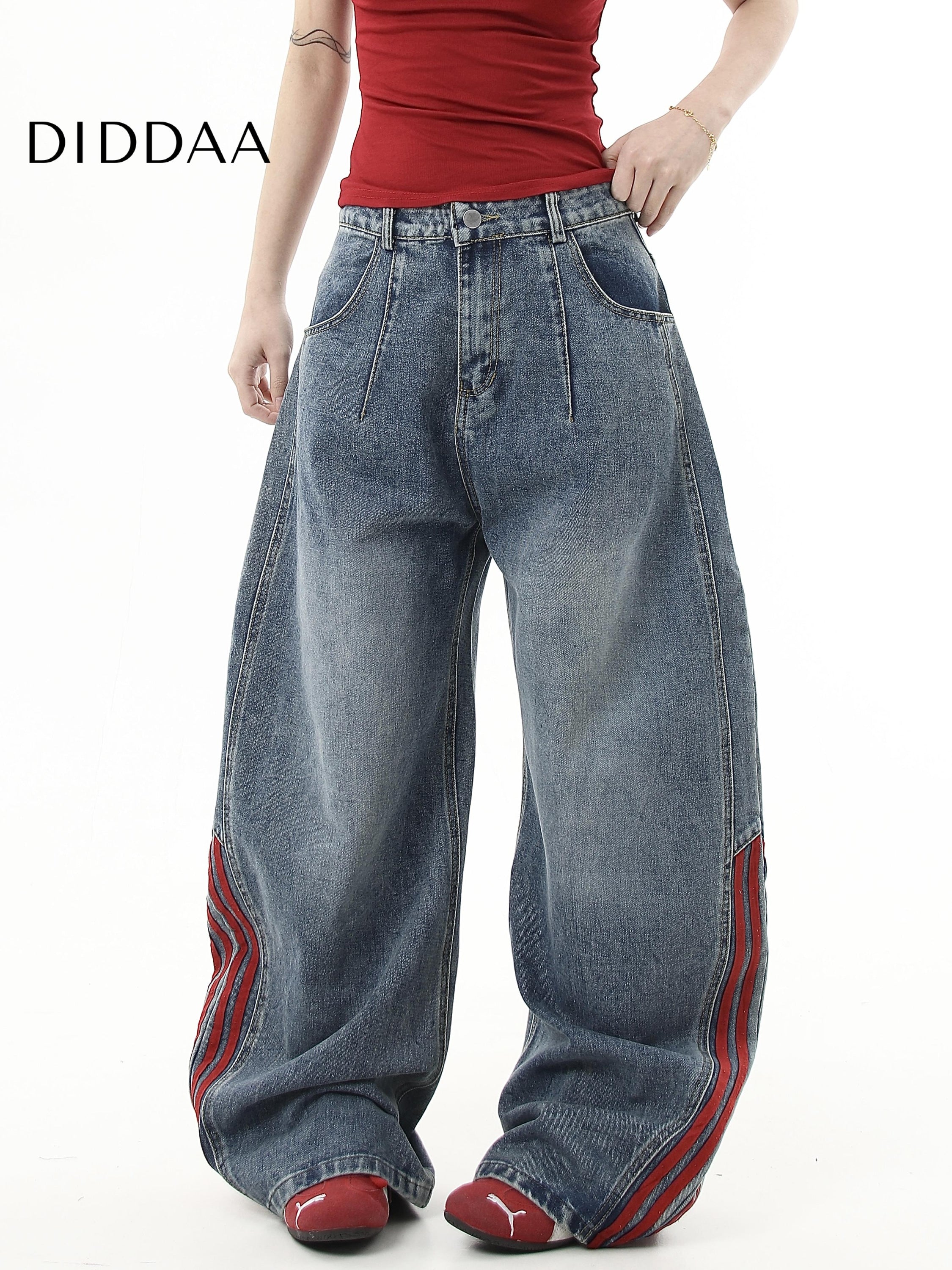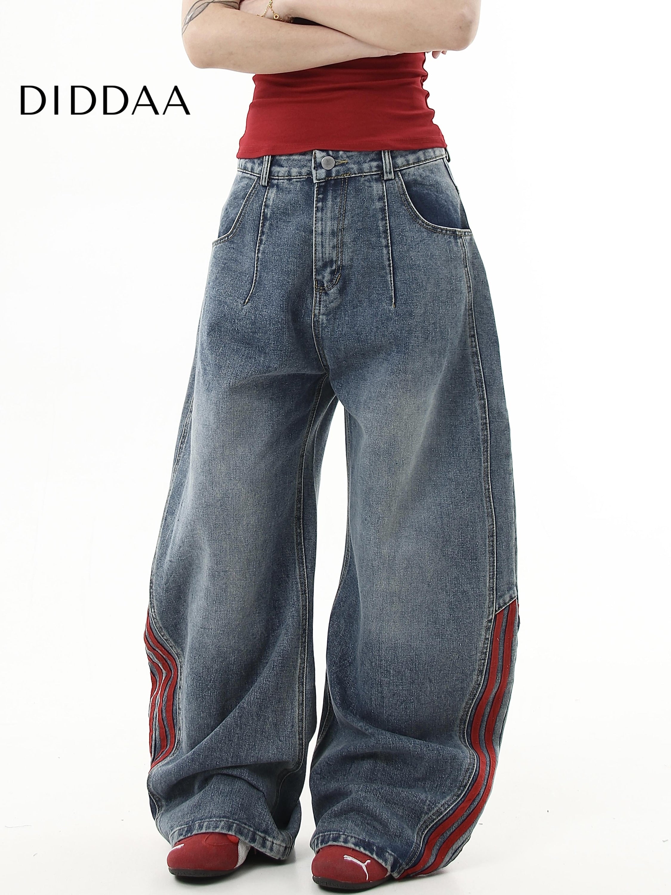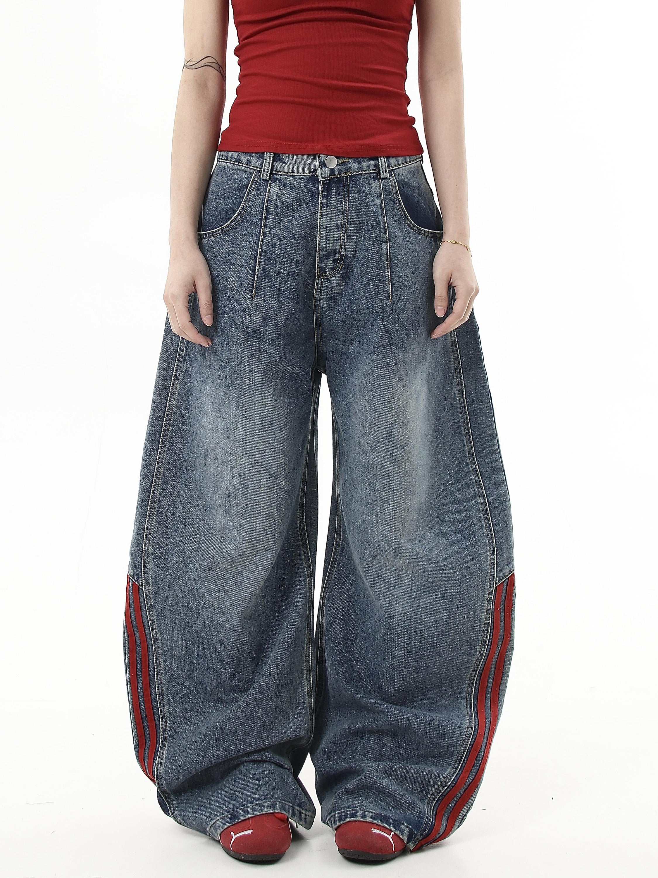 Red-Edged Distressed Loose Wide-Leg Jeans