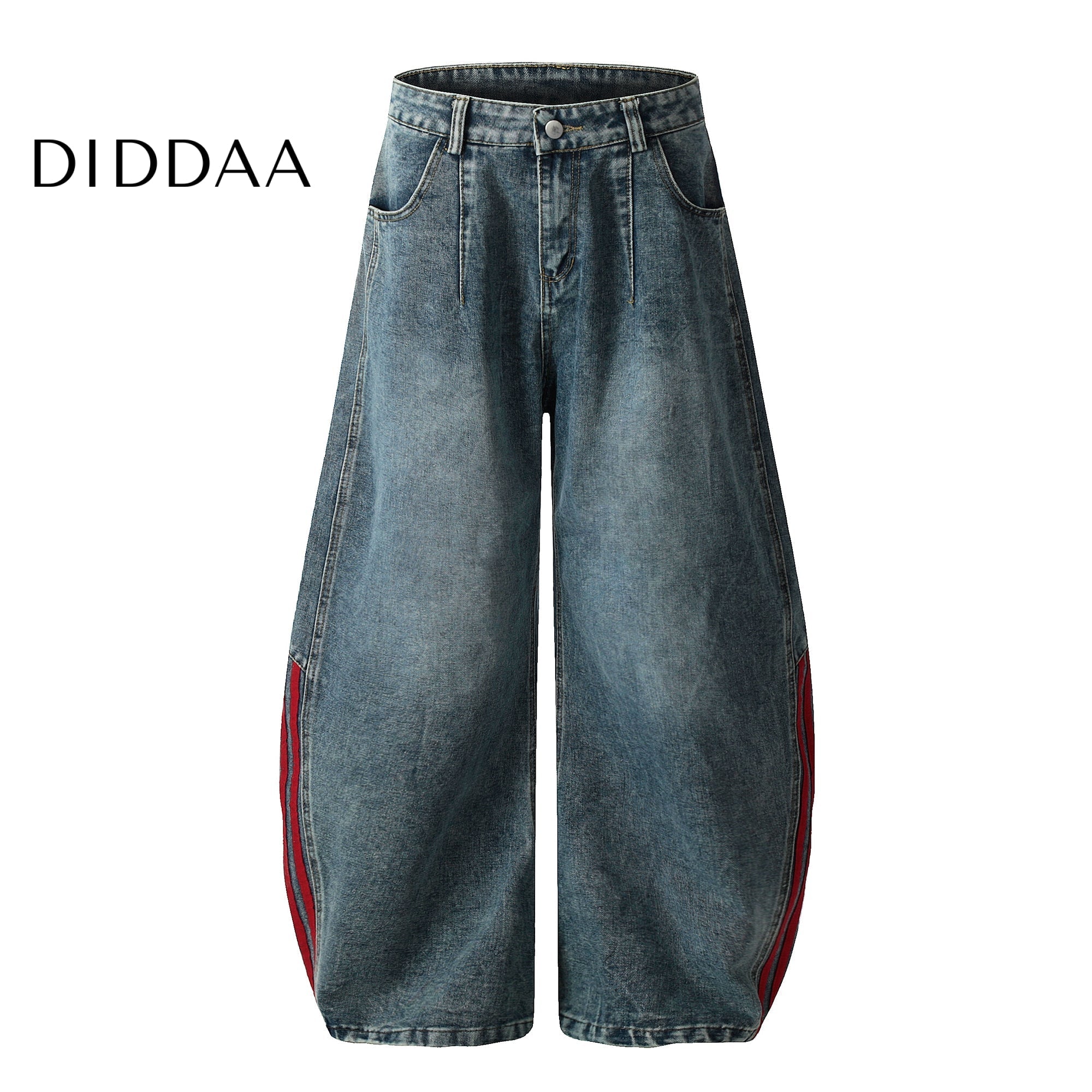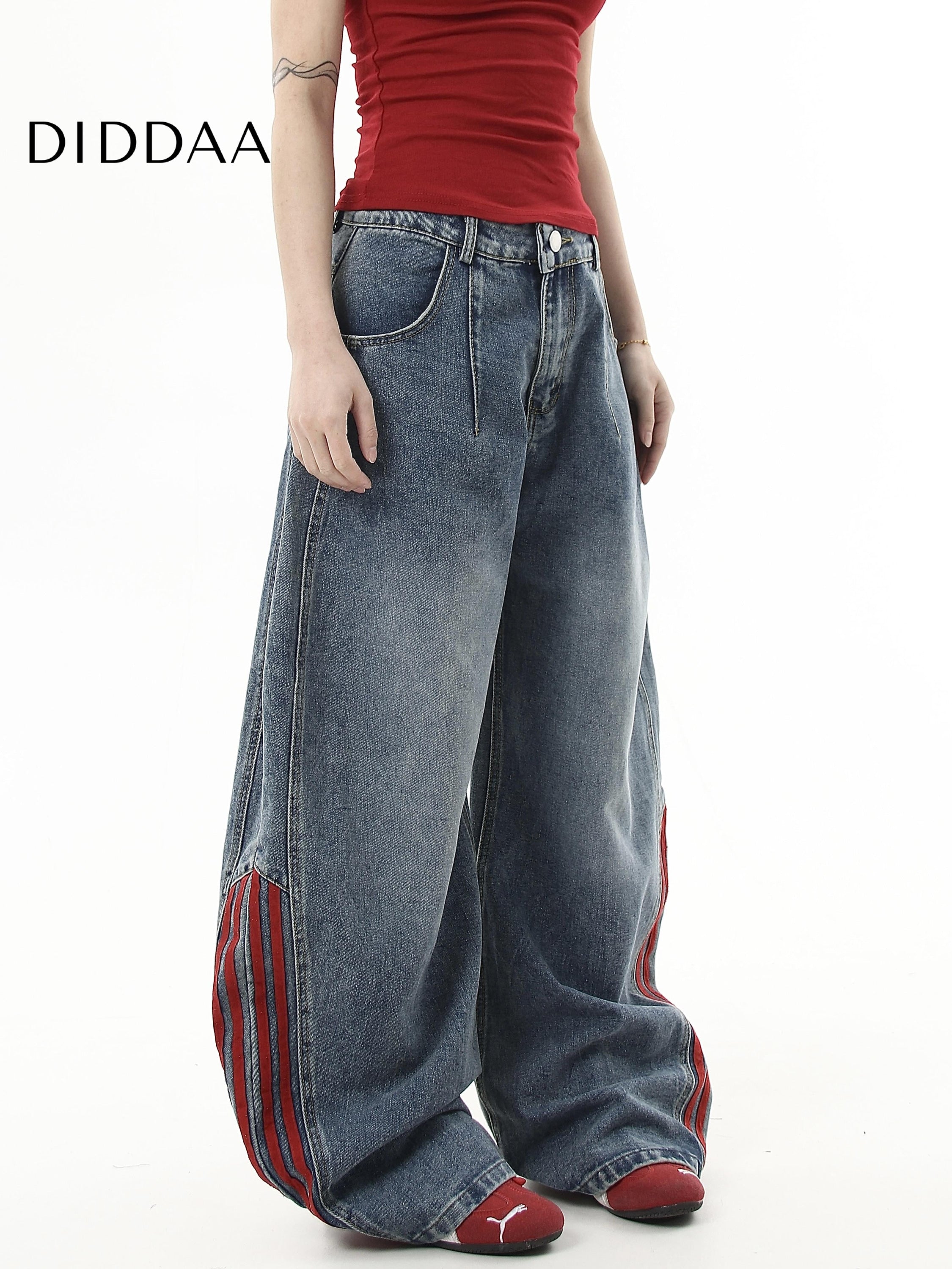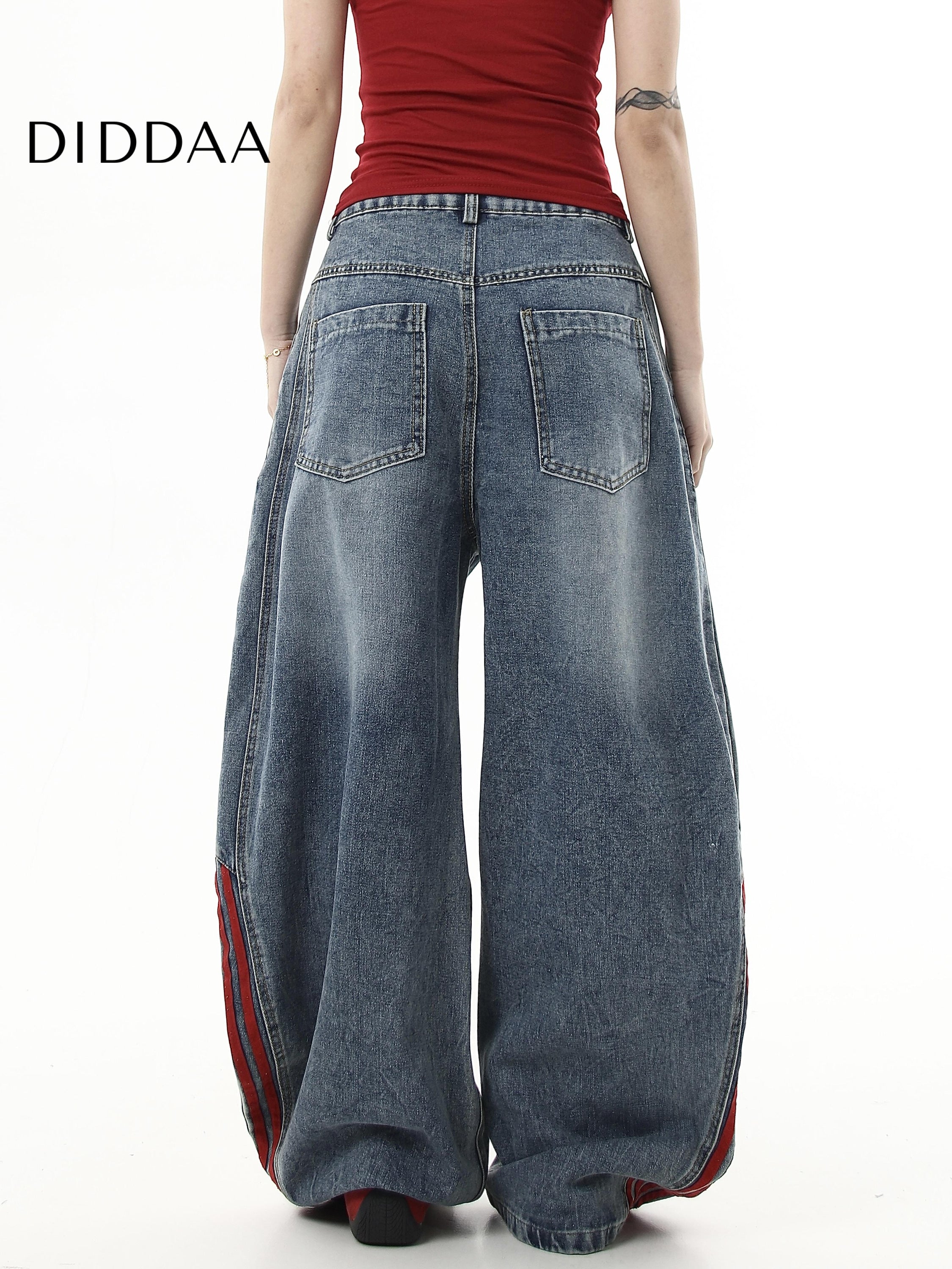 Red-Edged Distressed Loose Wide-Leg Jeans