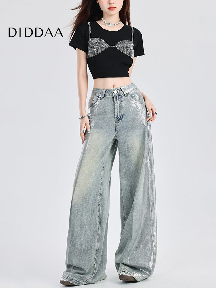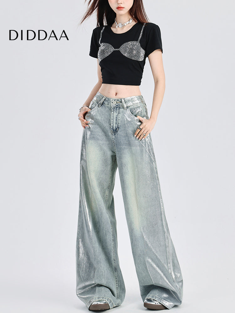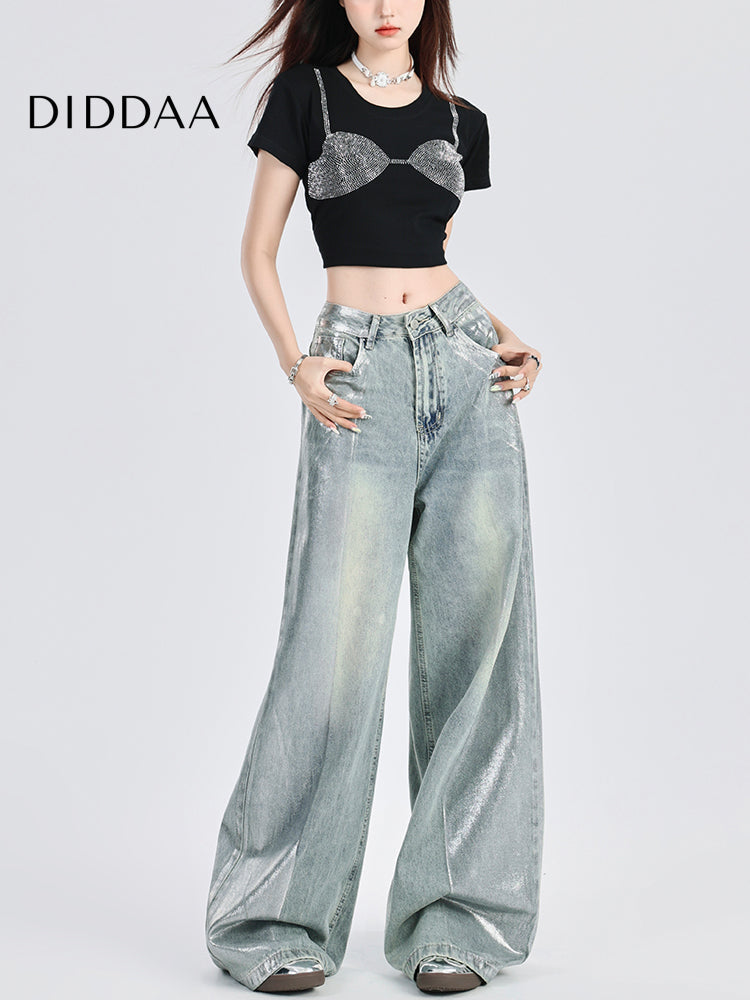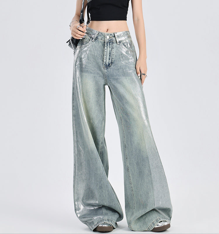 Silver Distressed Wide-Leg Jeans Women's High-Waisted Pants