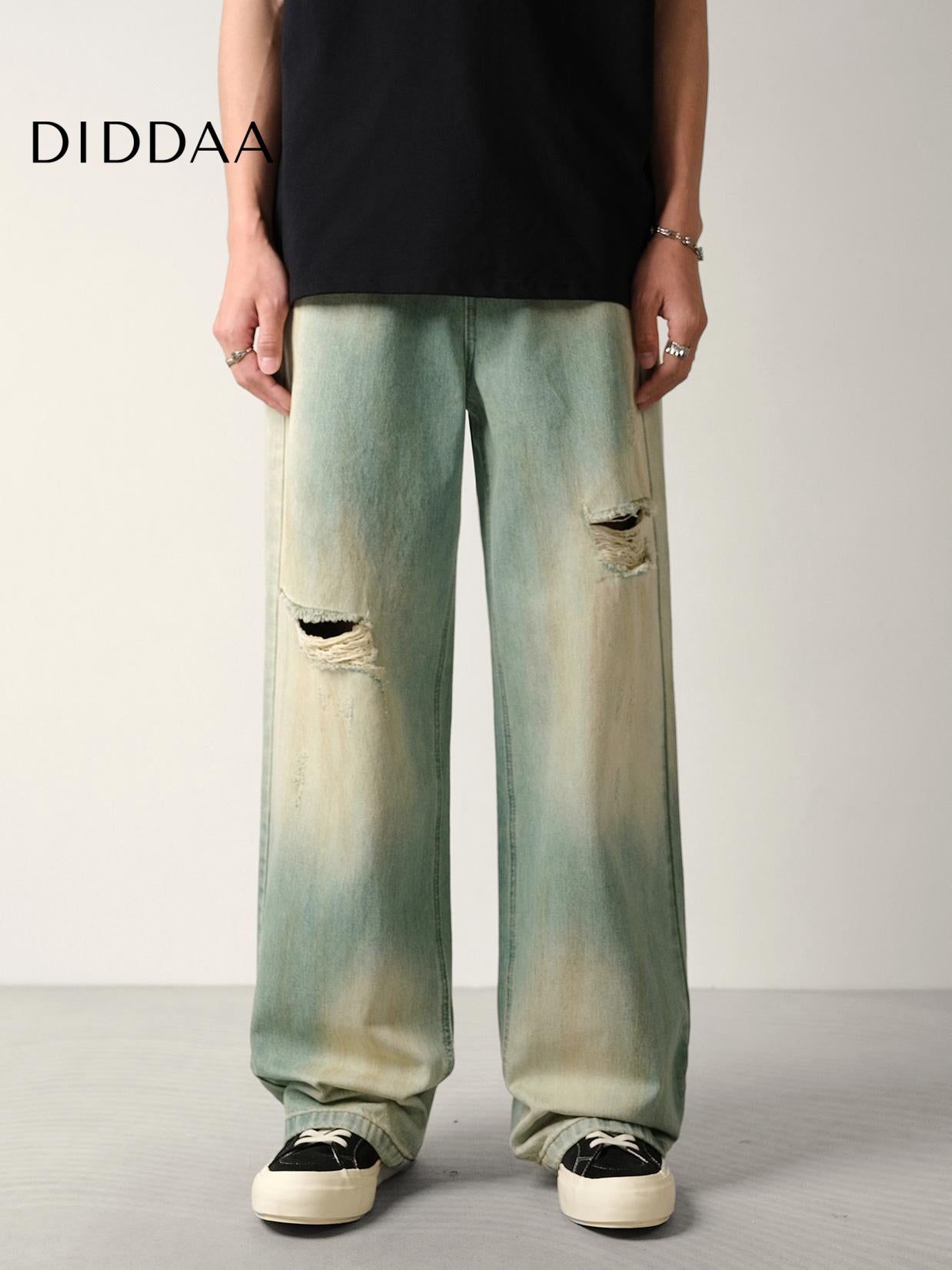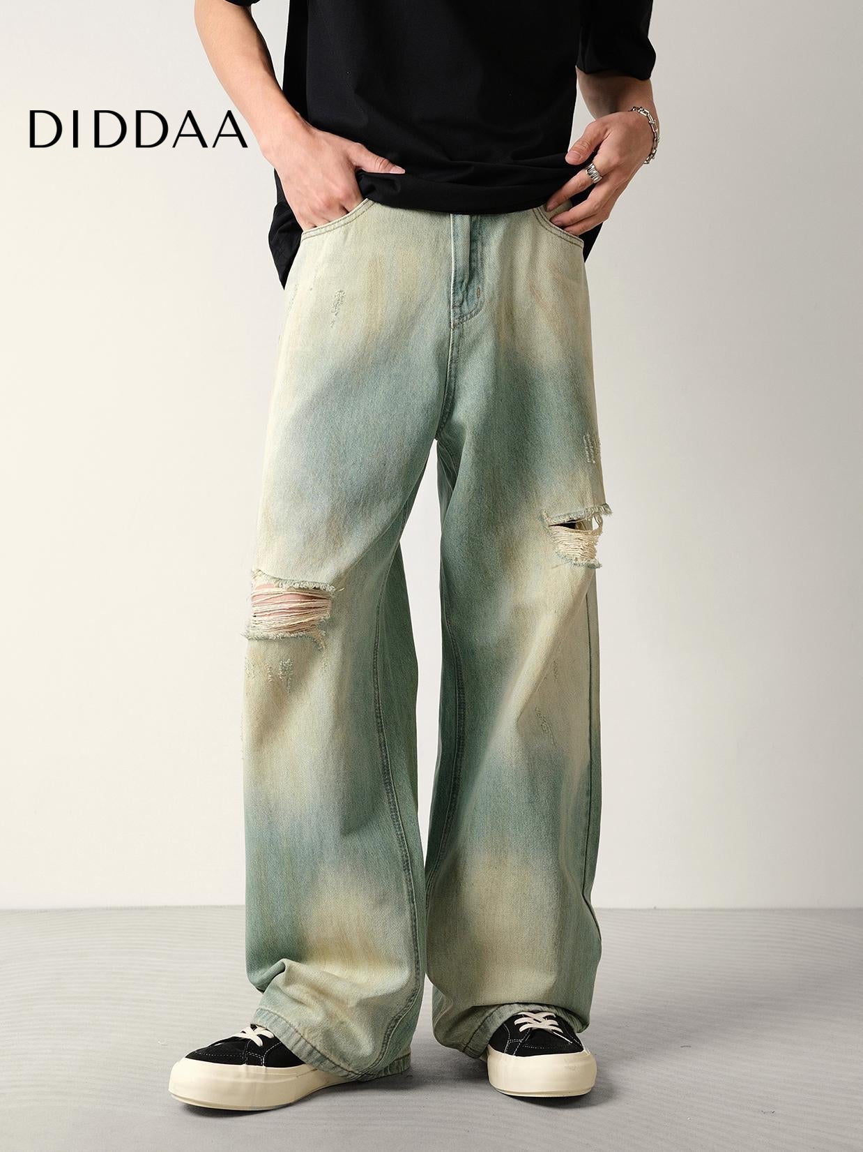 Washed Blue Distressed Loose Fit Wide-Leg Jeans