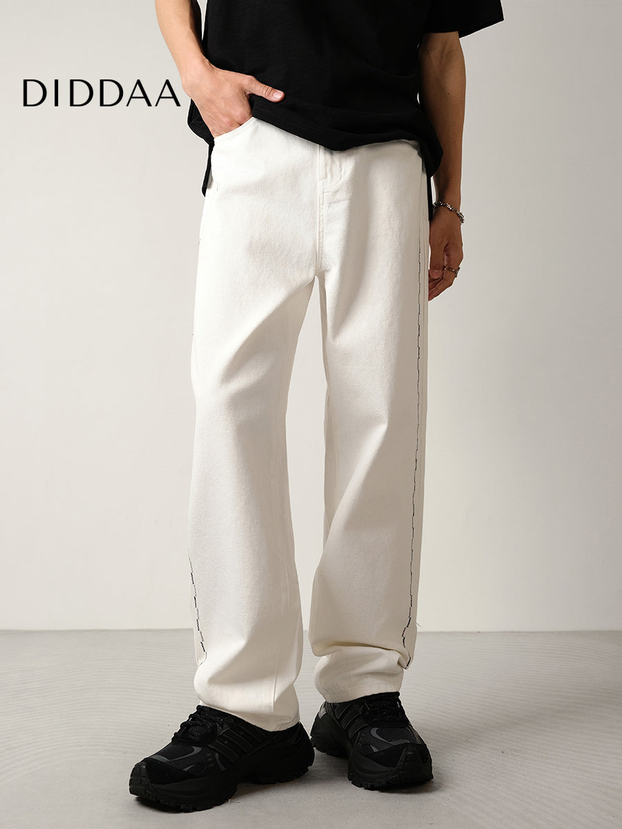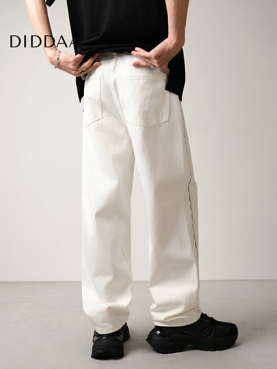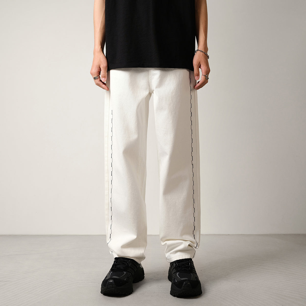 White Embroidered Contrast Loose Wide-Leg Jeans
