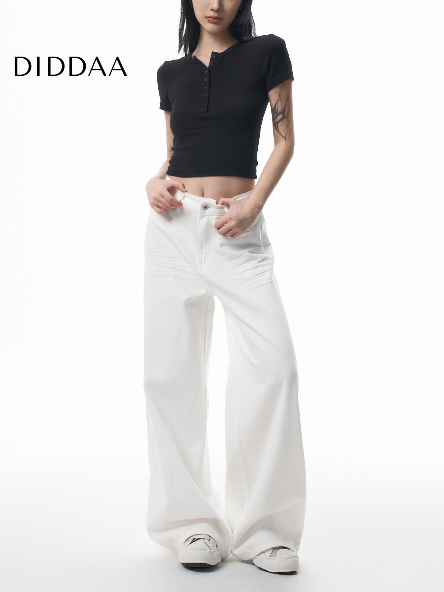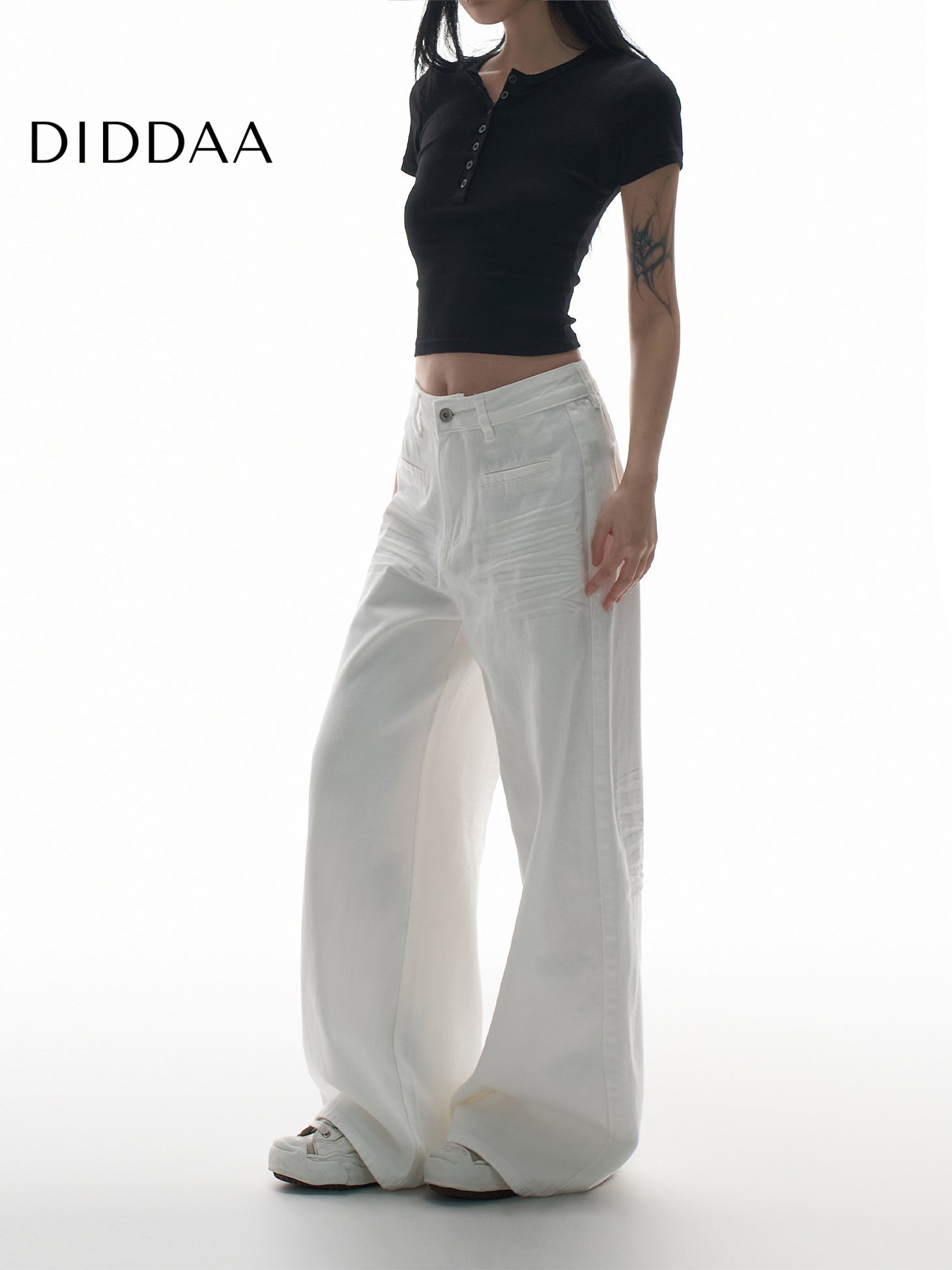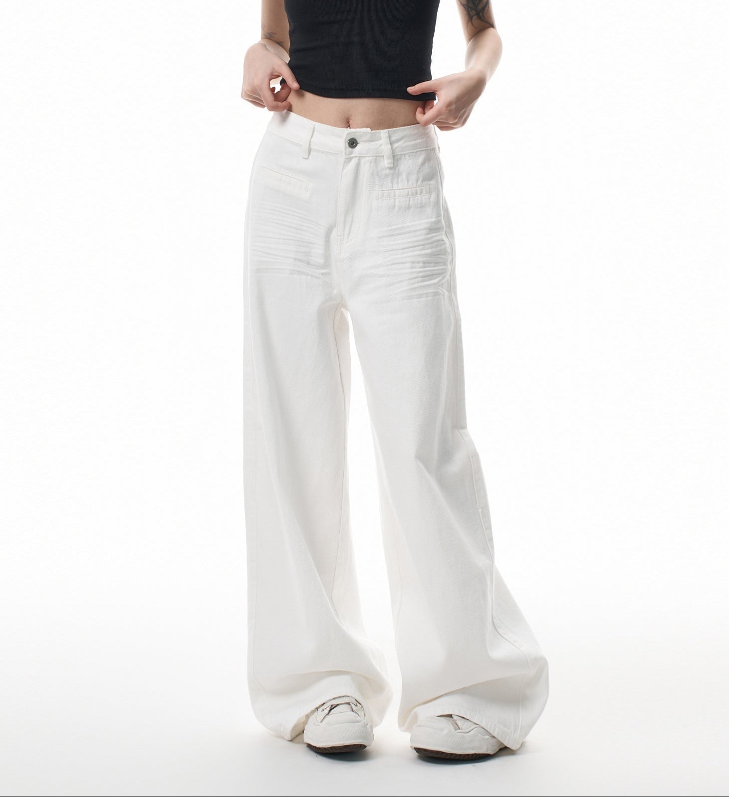 White Pressed-Pleated Wide-Leg Casual Jeans